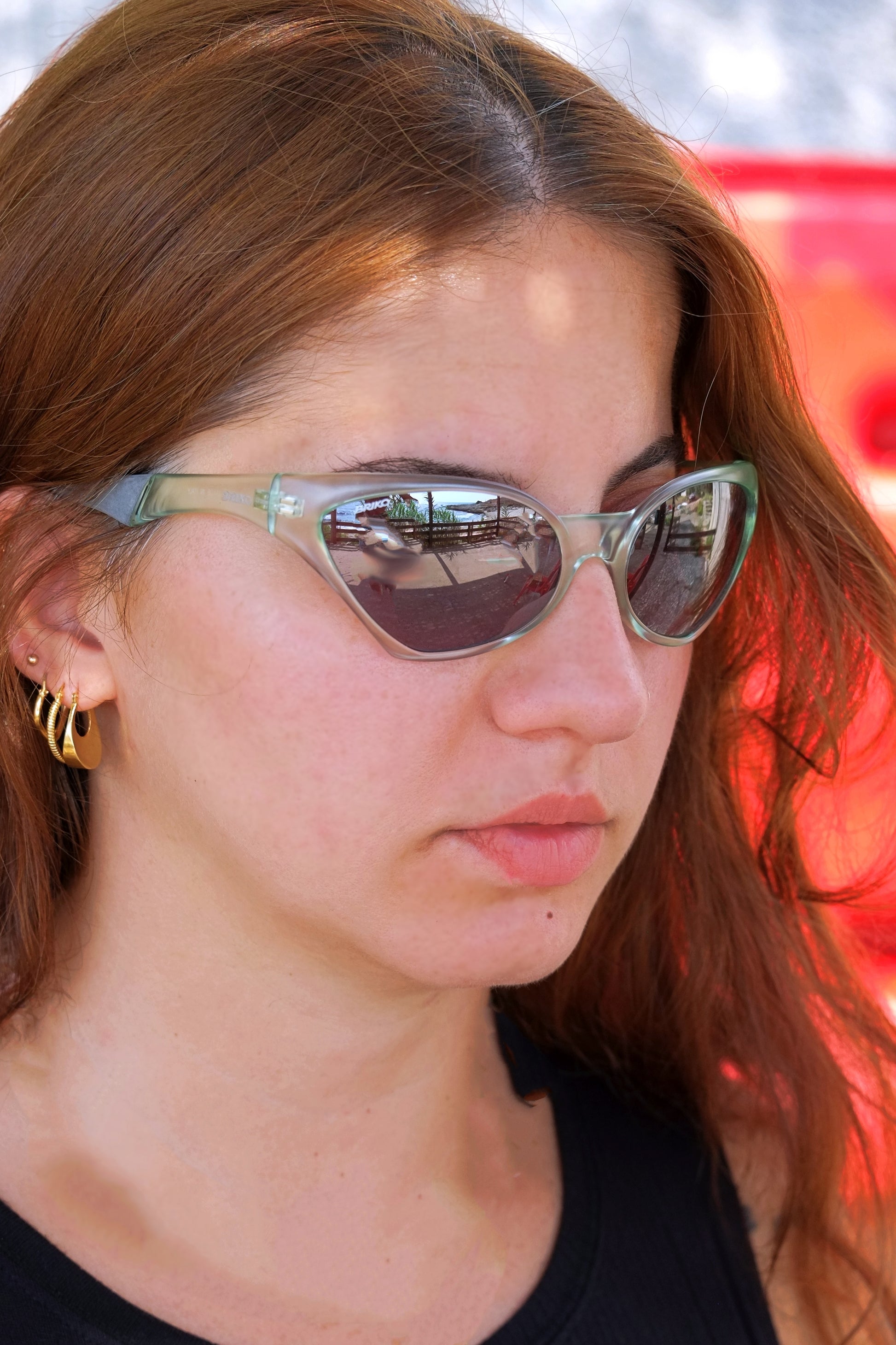 Vintage late 90s Briko slanted frame sunglasses. Sporty and resistant, specially designed for sports enthusiasts who want to be noticed. Model is wearing Crystal Ice.
