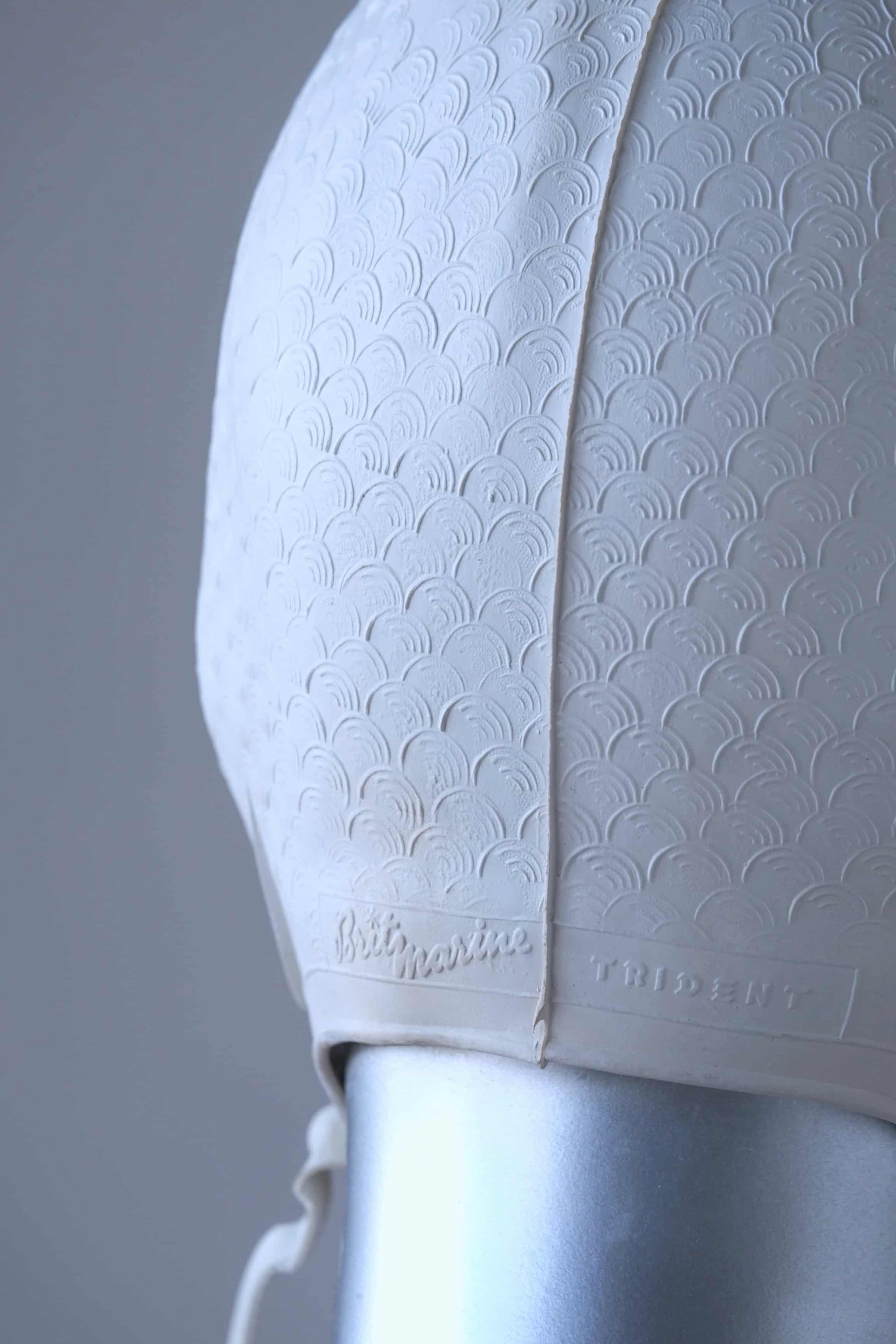 Vintage Brit Marine swim cap from the 1950s or 1960s, featuring a stylish scalloped scale pattern, a contoured design over the ears, and a secure chin strap. A rare and sought-after piece for collectors and vintage swimwear enthusiasts.