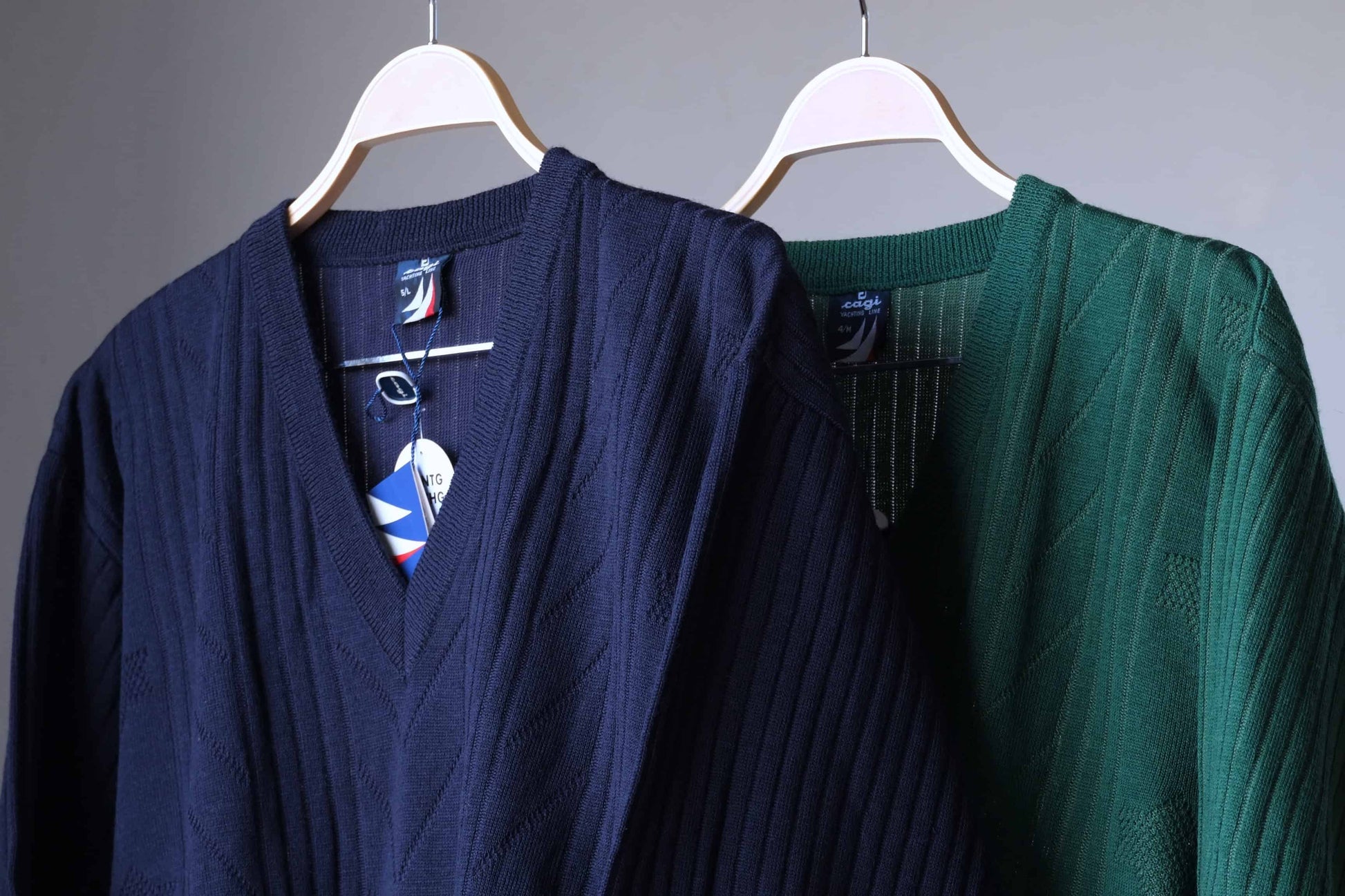 Vintage V-neck sweater with a geometrical knit pattern on the front, exists in emerald green and navy blue.