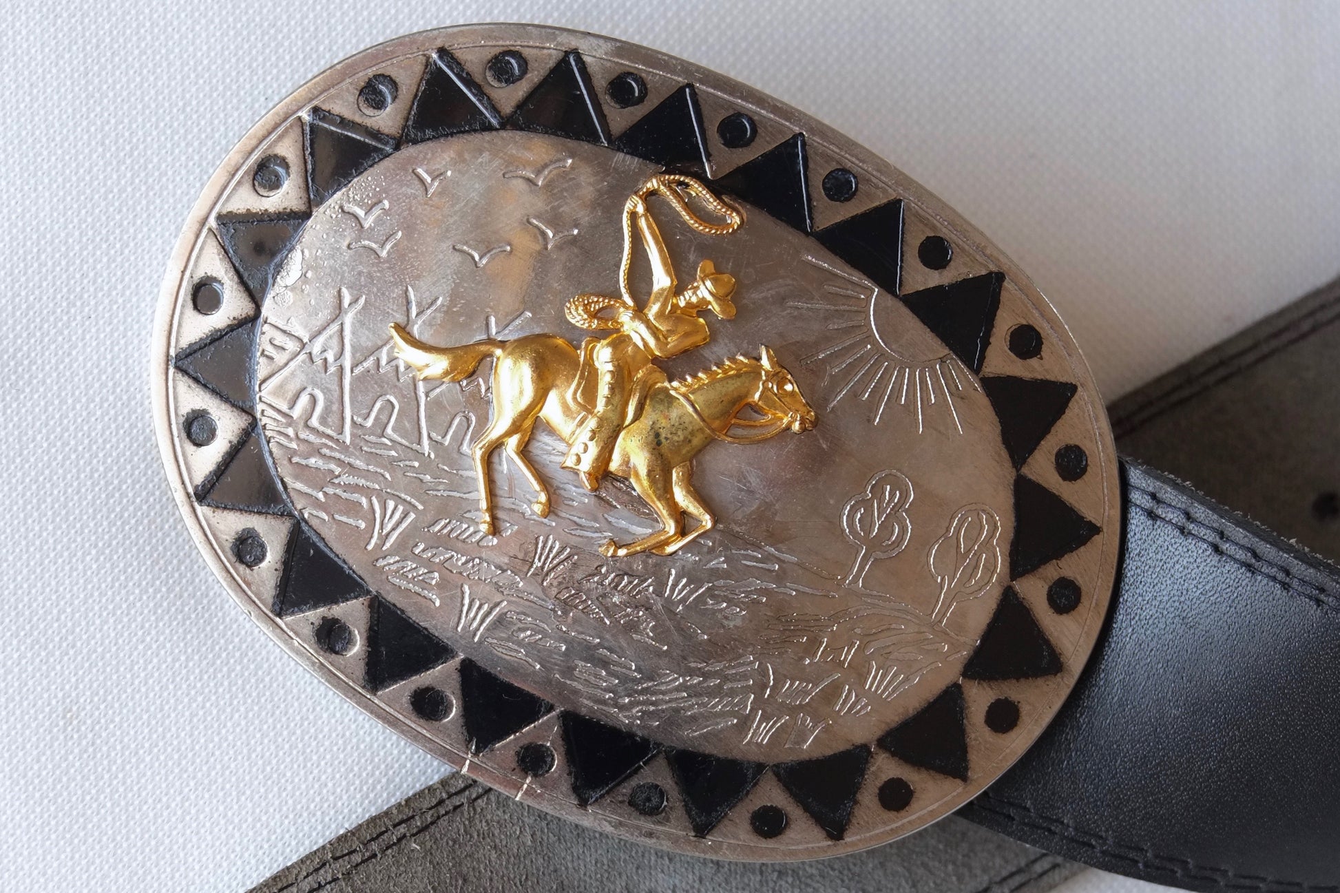 Vintage leather cowboy belt from the 70s by the brand Chambord with a carved western brass buckle, soft leather strap.
