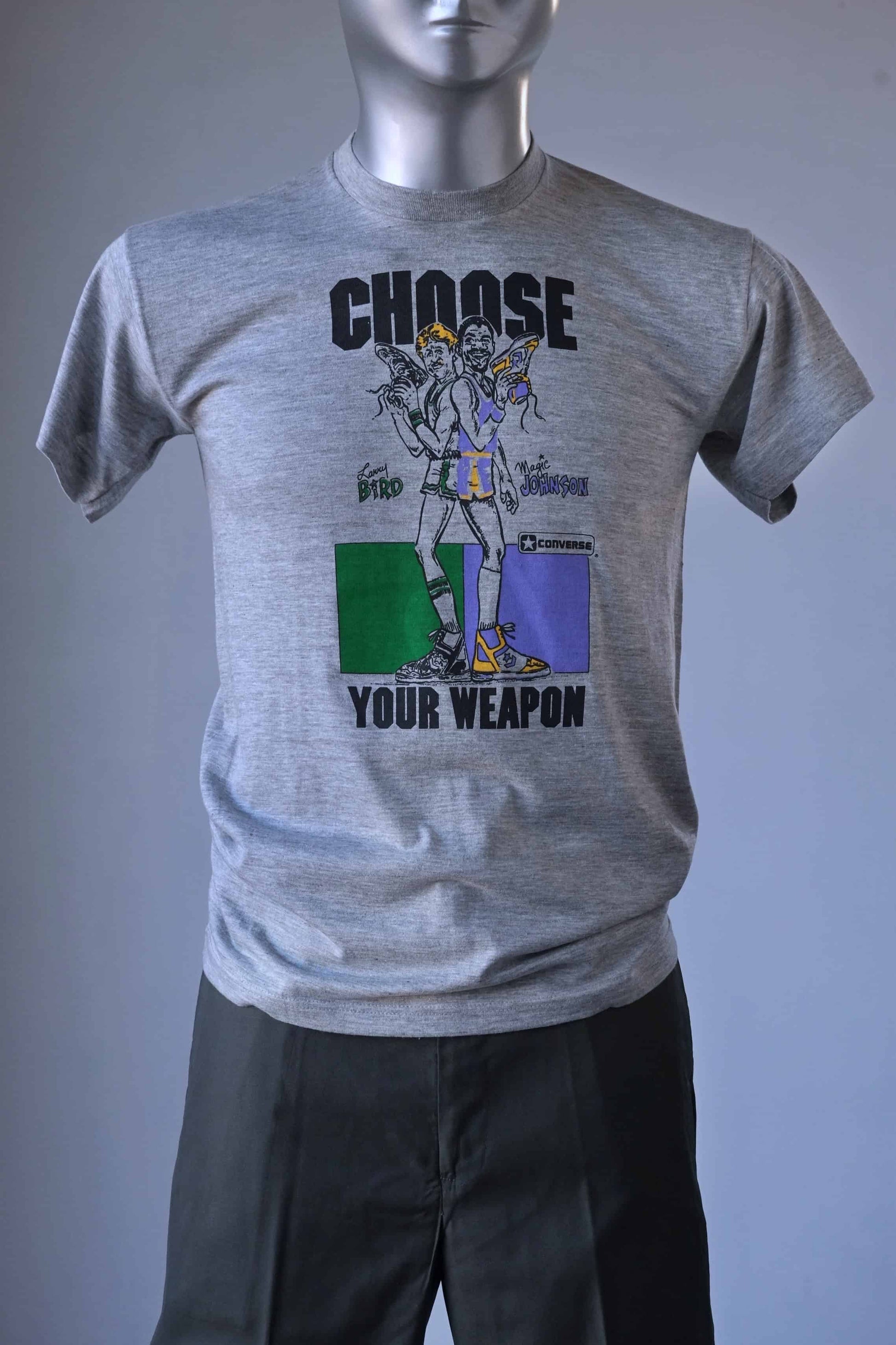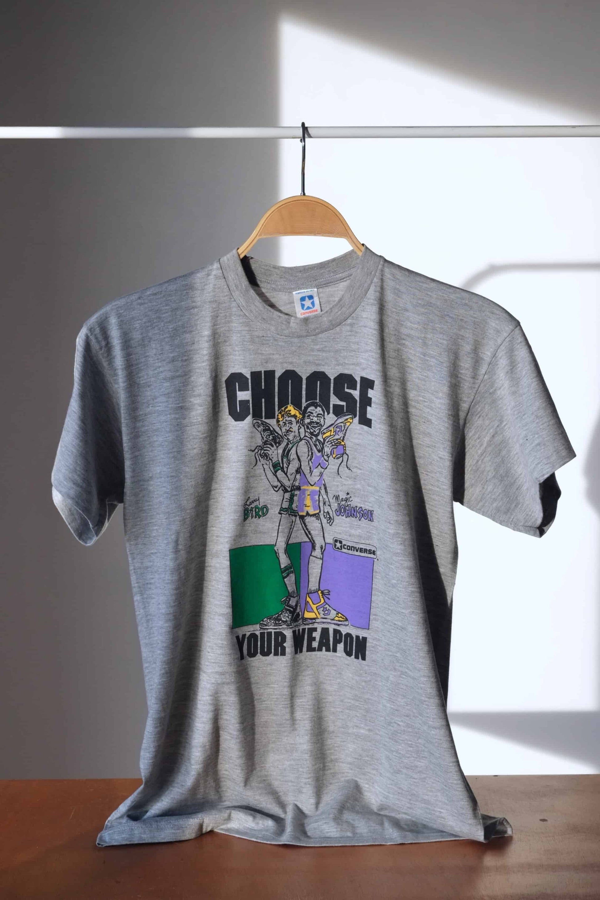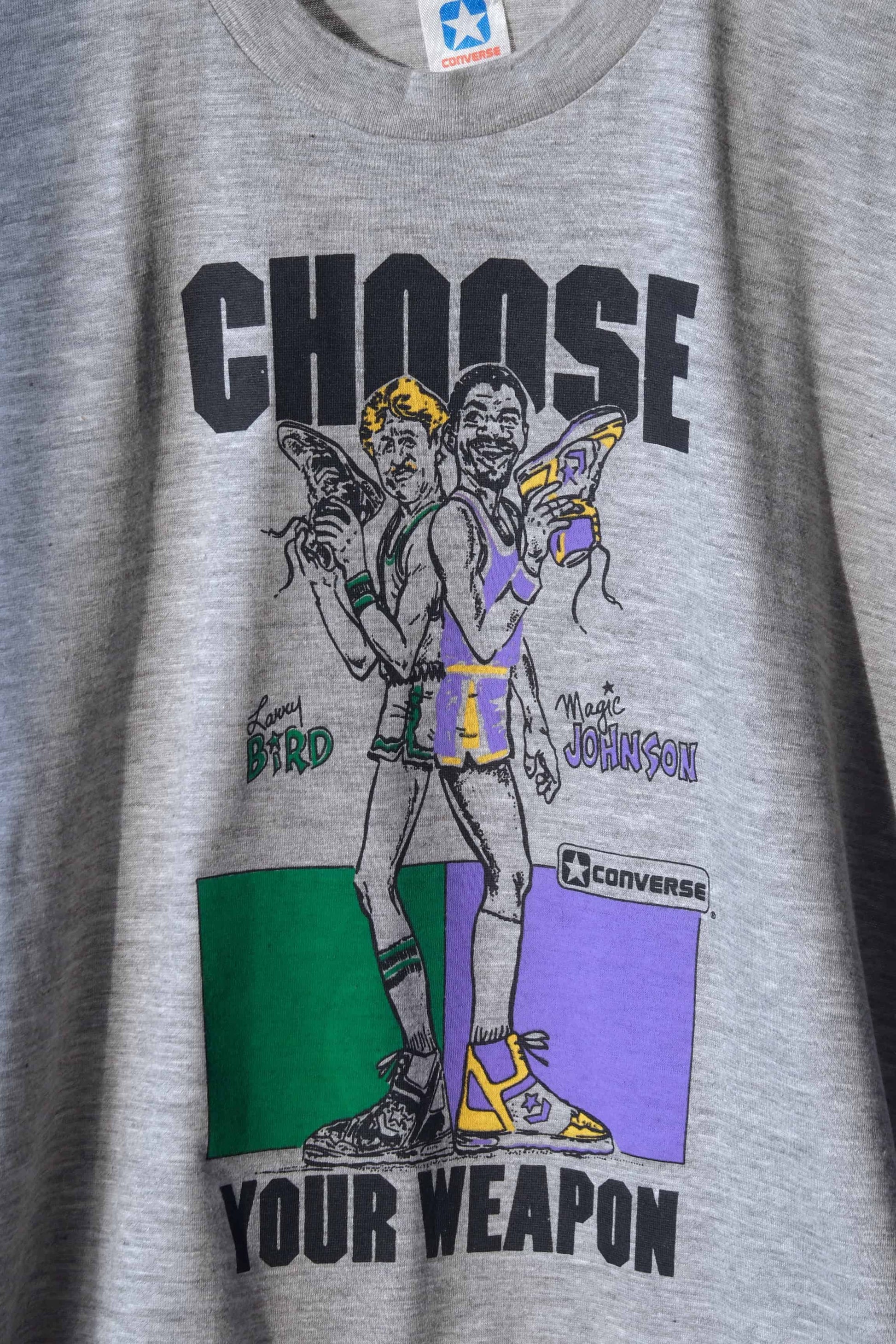 Rare Converse t-shirt of Magic Johnson and Larry Bird circa 1986 when the Converse Weapon basketball shoes were introduced. They were the first trainers to be personalized, Converse used the Magic Johnson and Larry Bird rivalry to launch the Magic Shoe in Lakers purple, gold and white.