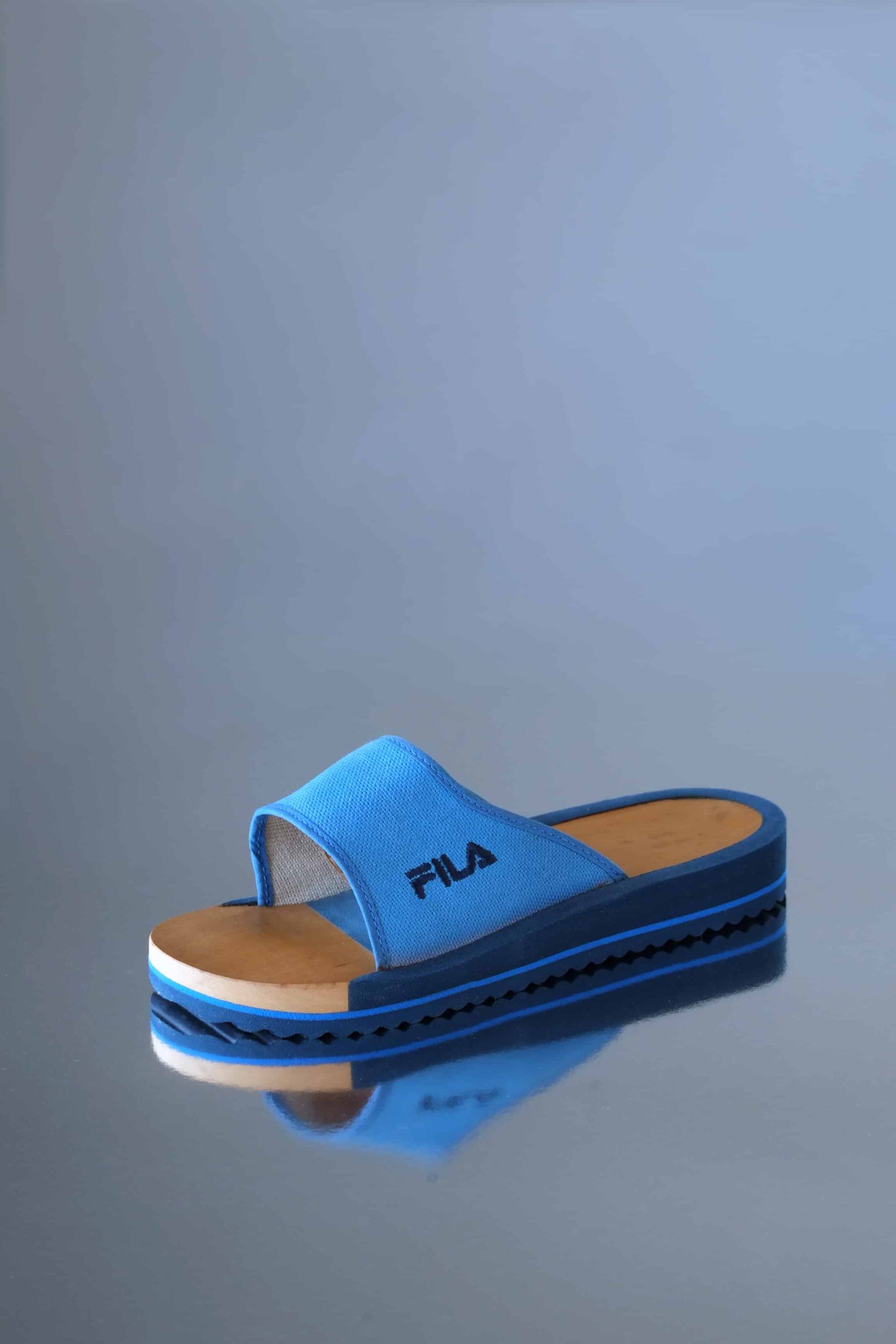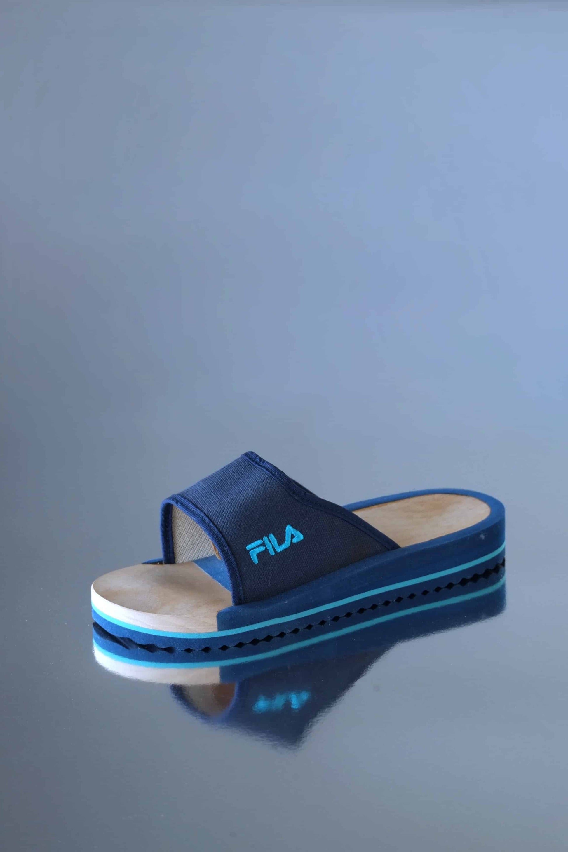 Fila 90s Pool Slides. Slide into the '90s with these Fila Pool Slides! Featuring a canvas upper and a wooden base, this retro style is sure to turn heads!