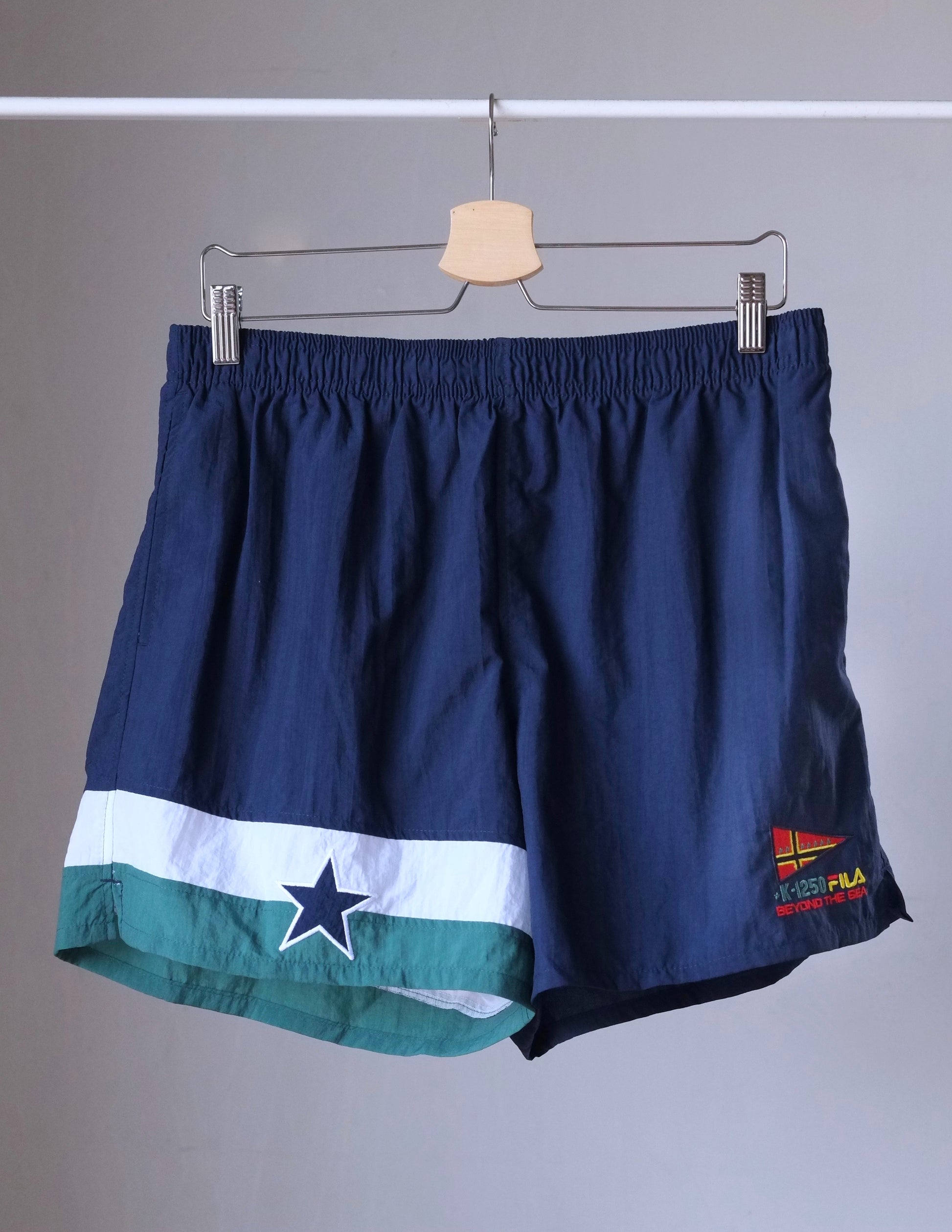 Featuring 2 horizontal stripes and a star on one side and an embroidered sailing flag and the Fila logo on the other. The length is mid-thigh.