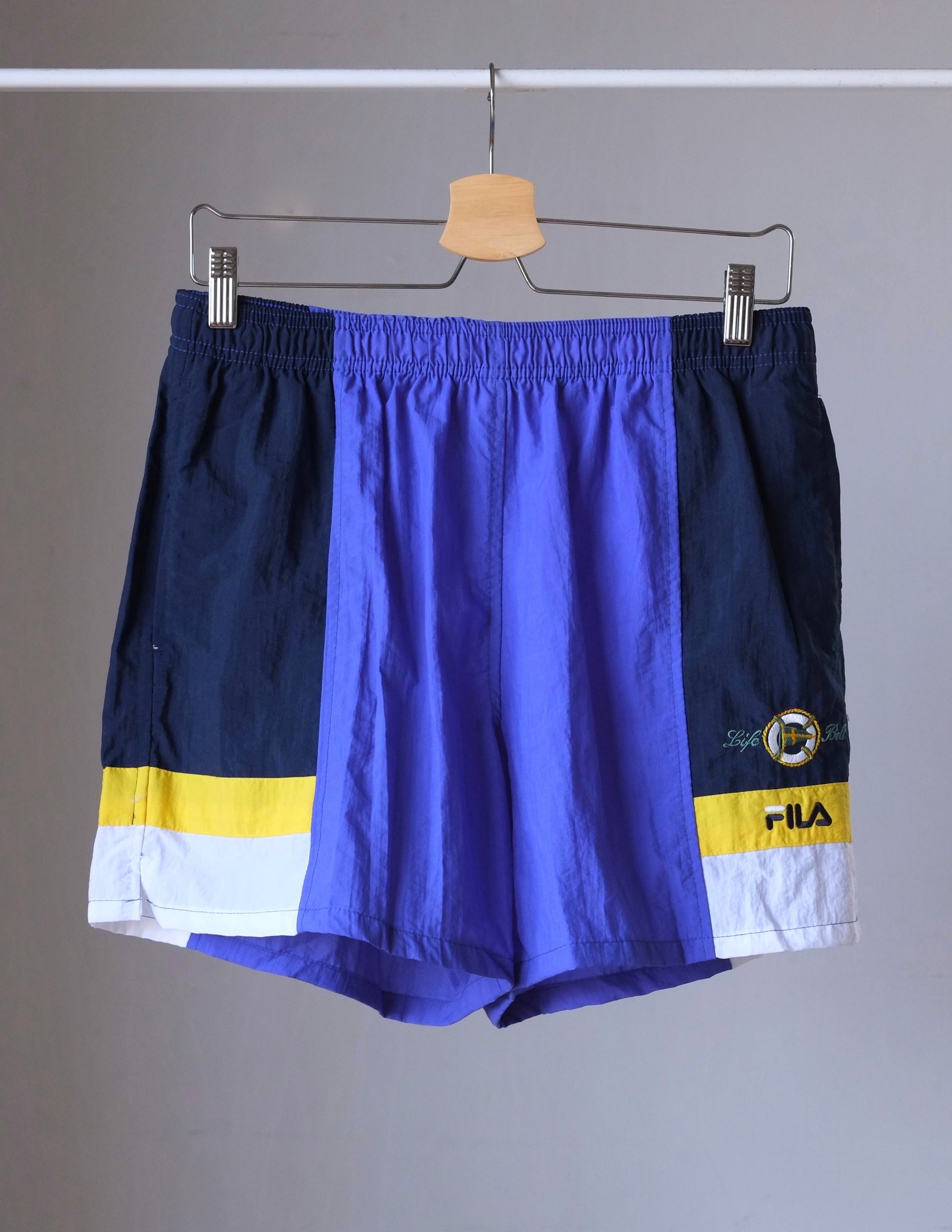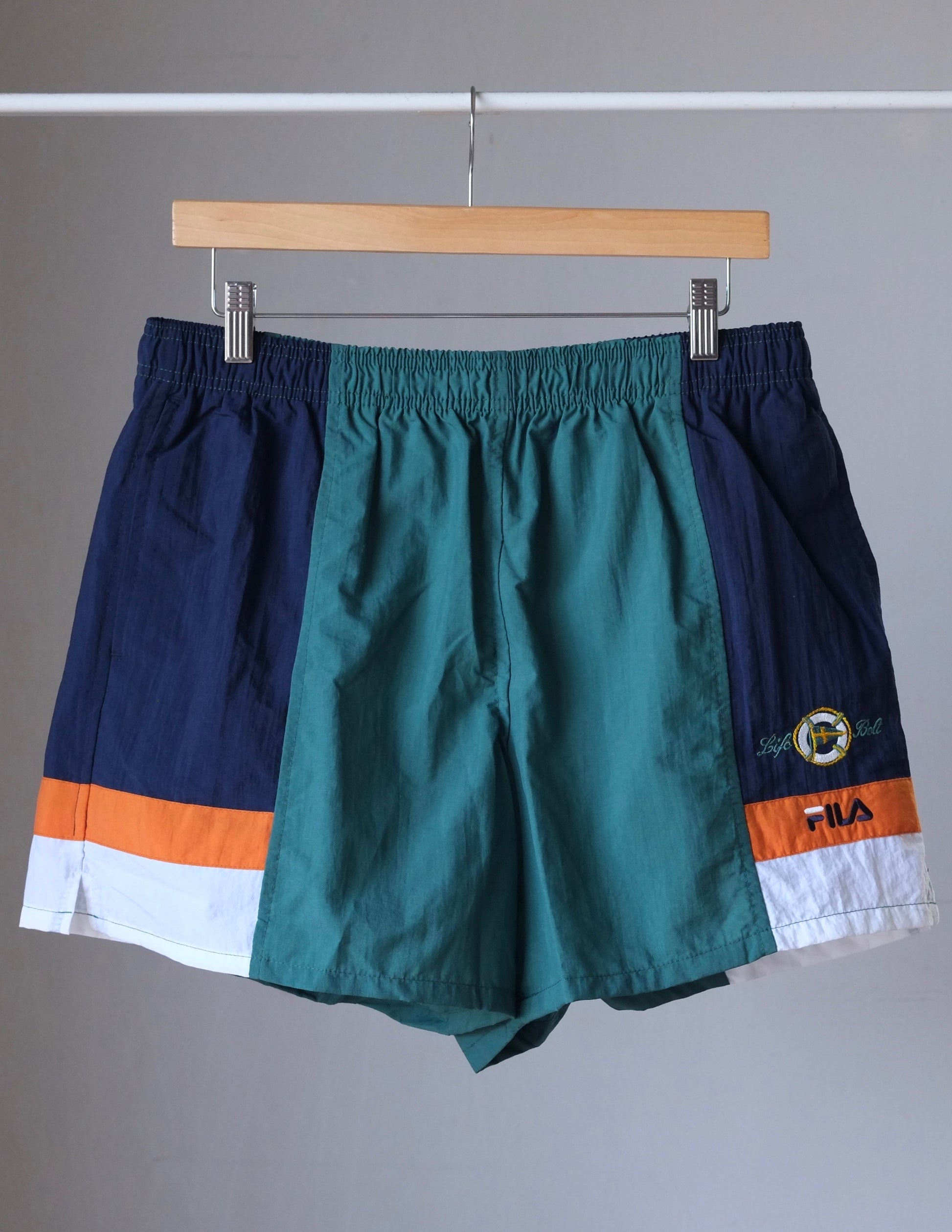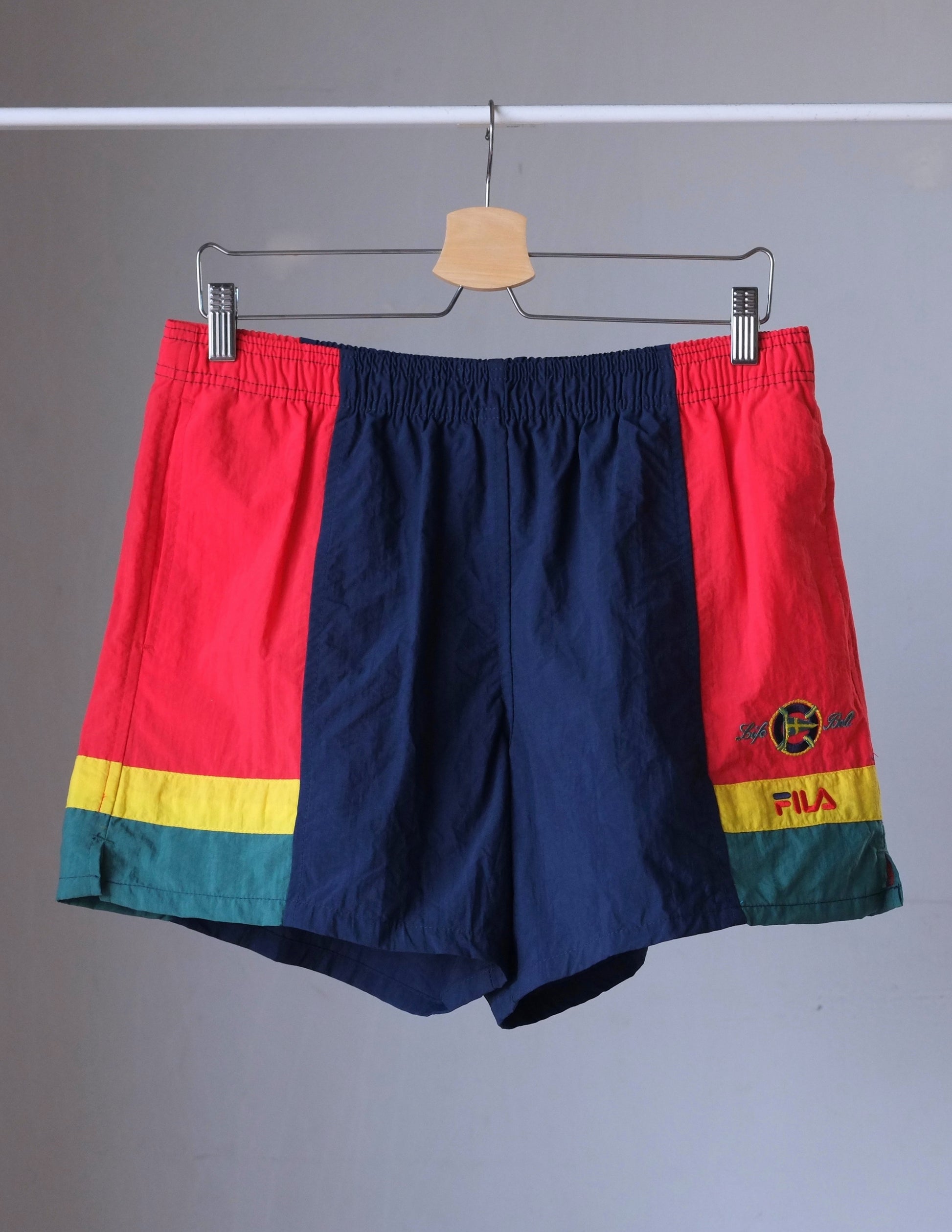 Colorblock shorts featuring an embroidered lifebelt and the Fila logo. The Length is mid-thigh.