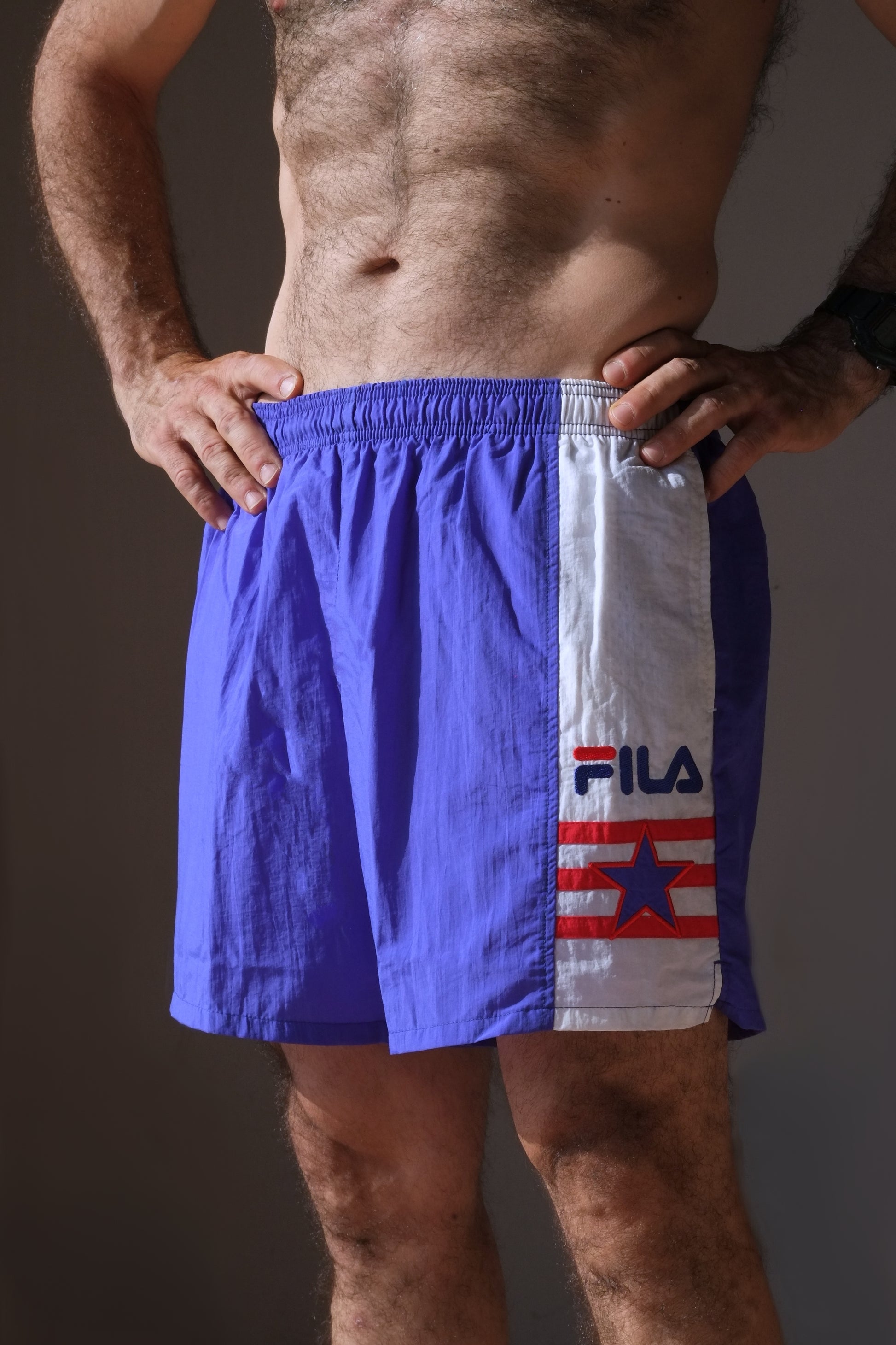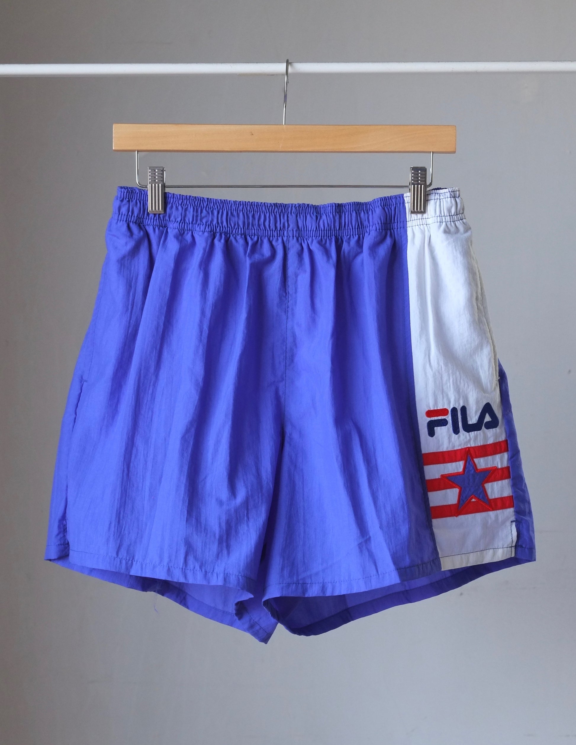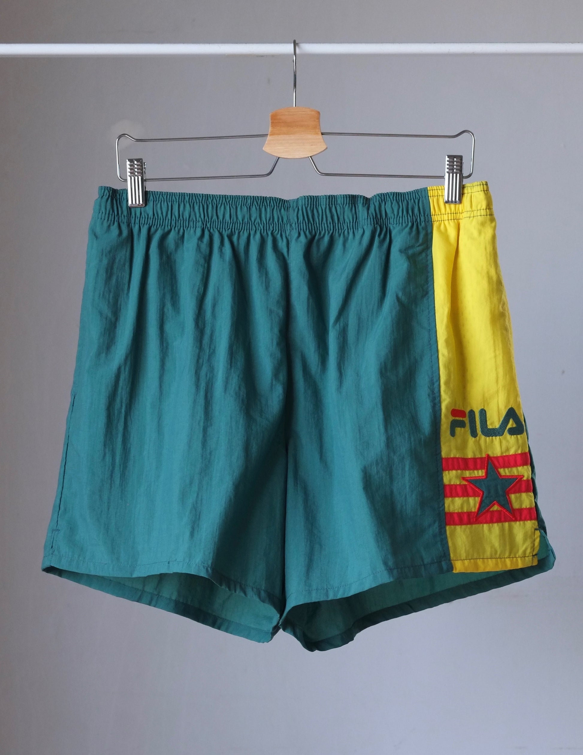 Two-tone shorts featuring stripes and a star on the side along with the Fila logo. These vintage 90s swim shorts come in 2 colorways, green/yellow and blue/white.