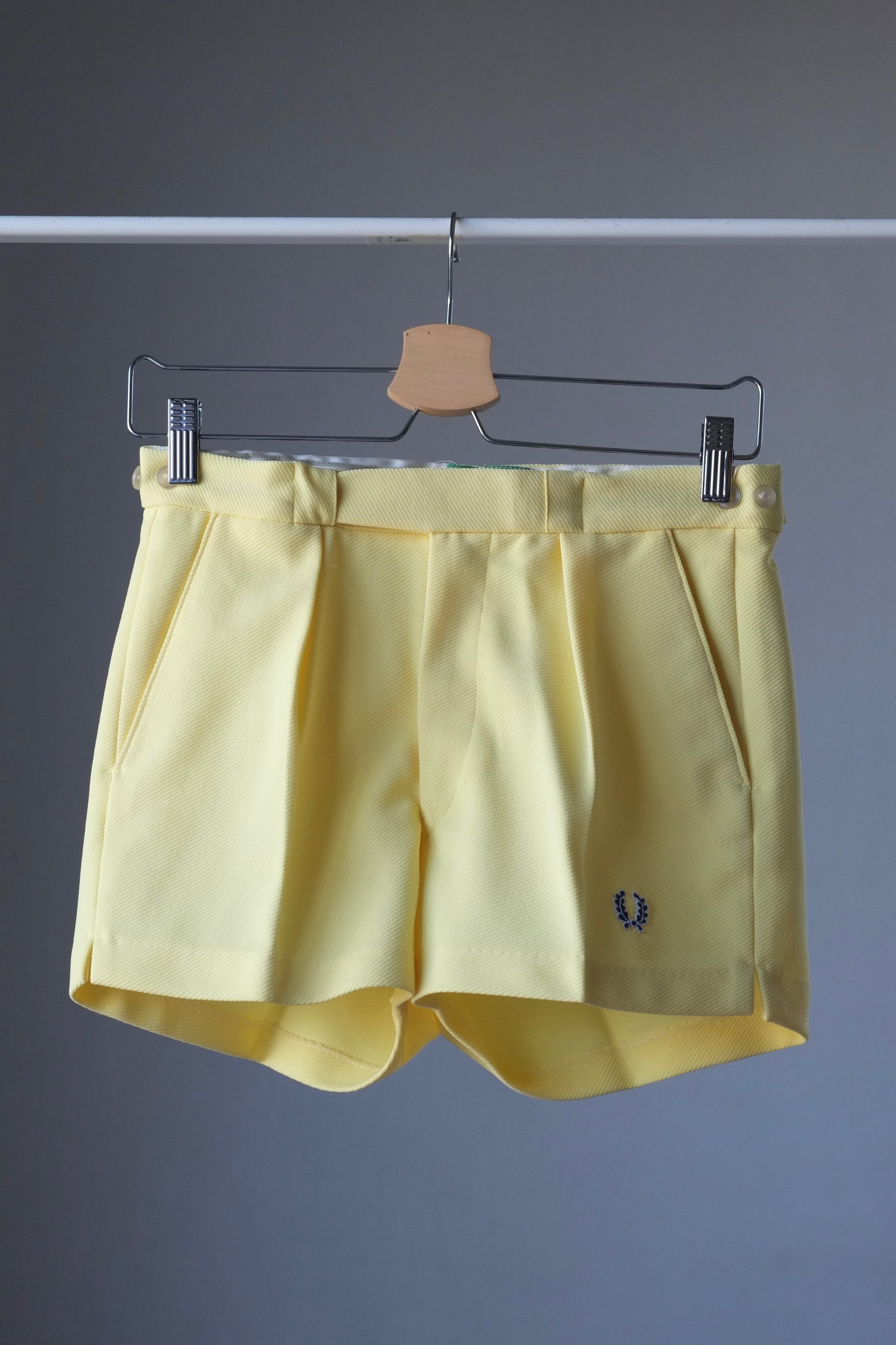 Vintage 70s Fred Perry tennis shorts in pale yellow, with two pockets and front pleats, featuring adjustable buttoned waist band, zipper closure and clasp and bar fastening, and small side slits on the legs.