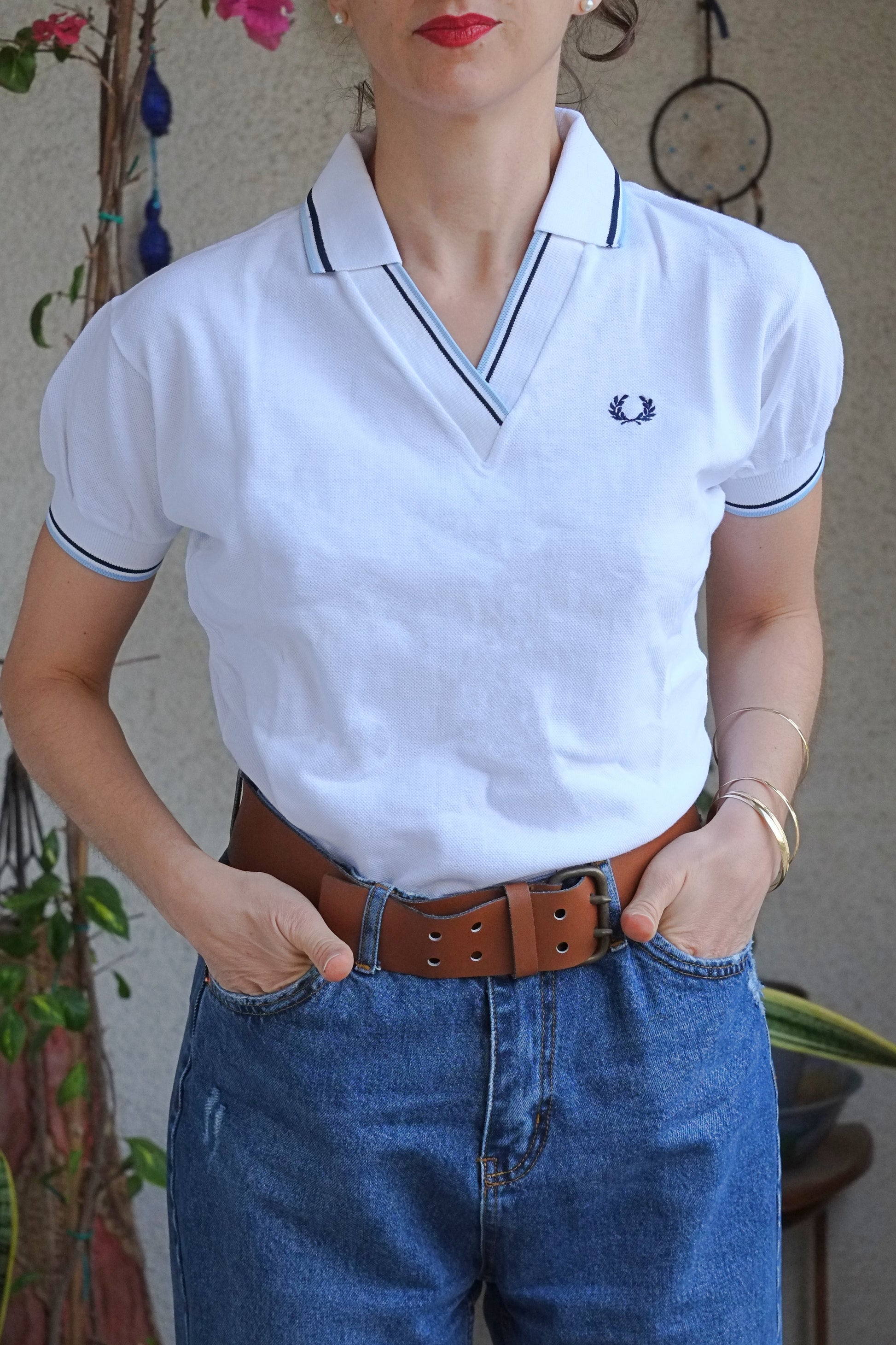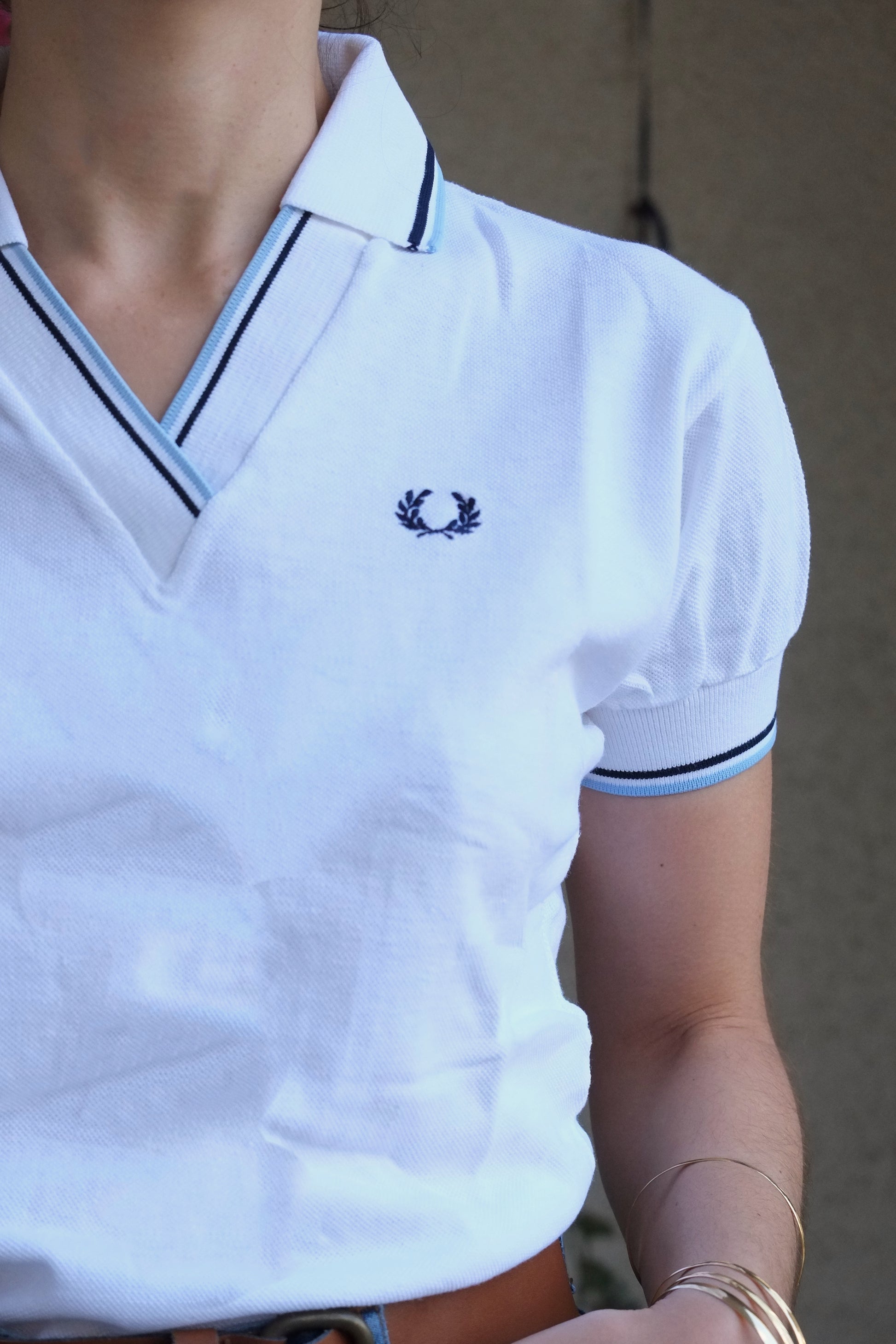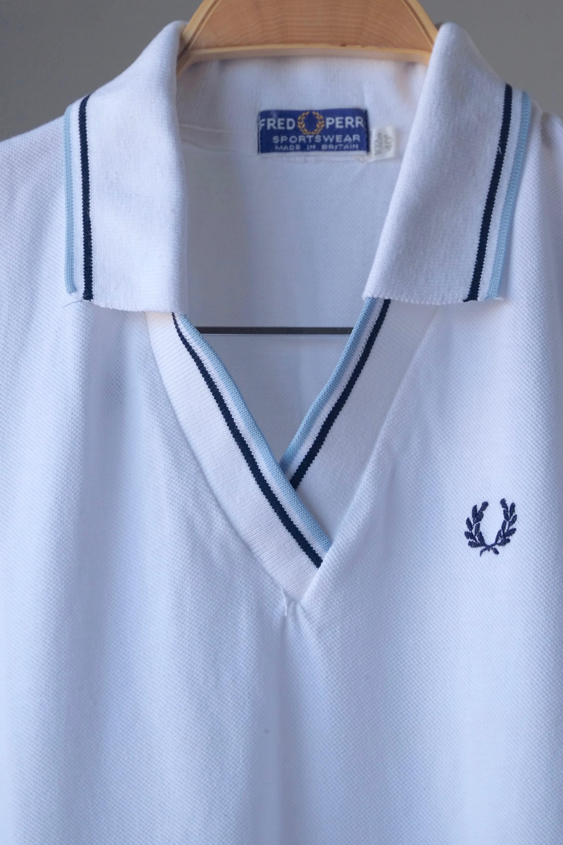 Vintage 70s, early 80s Fred Perry G796 polo shirt. A variation of the classic in cotton piqué, with its timeless casual appeal. Ribbed V-neck mounted by a polo neck. Classic white with blue and navy stripes.