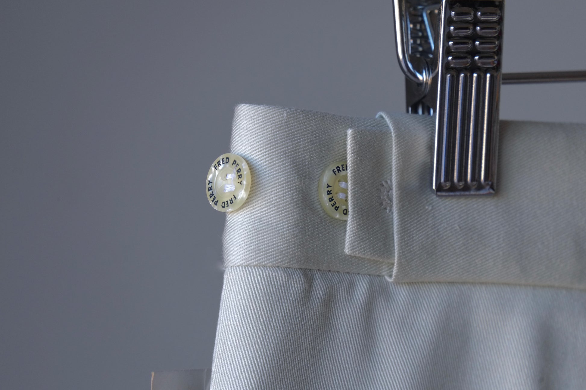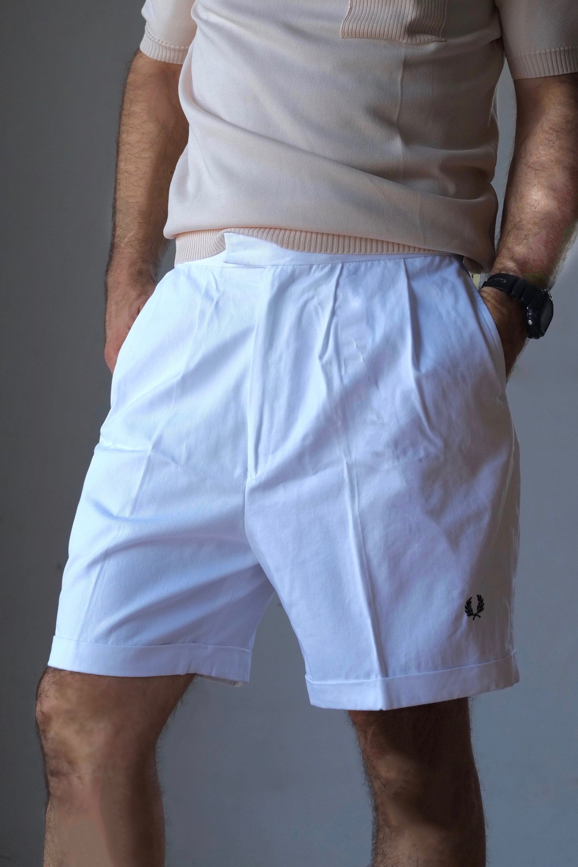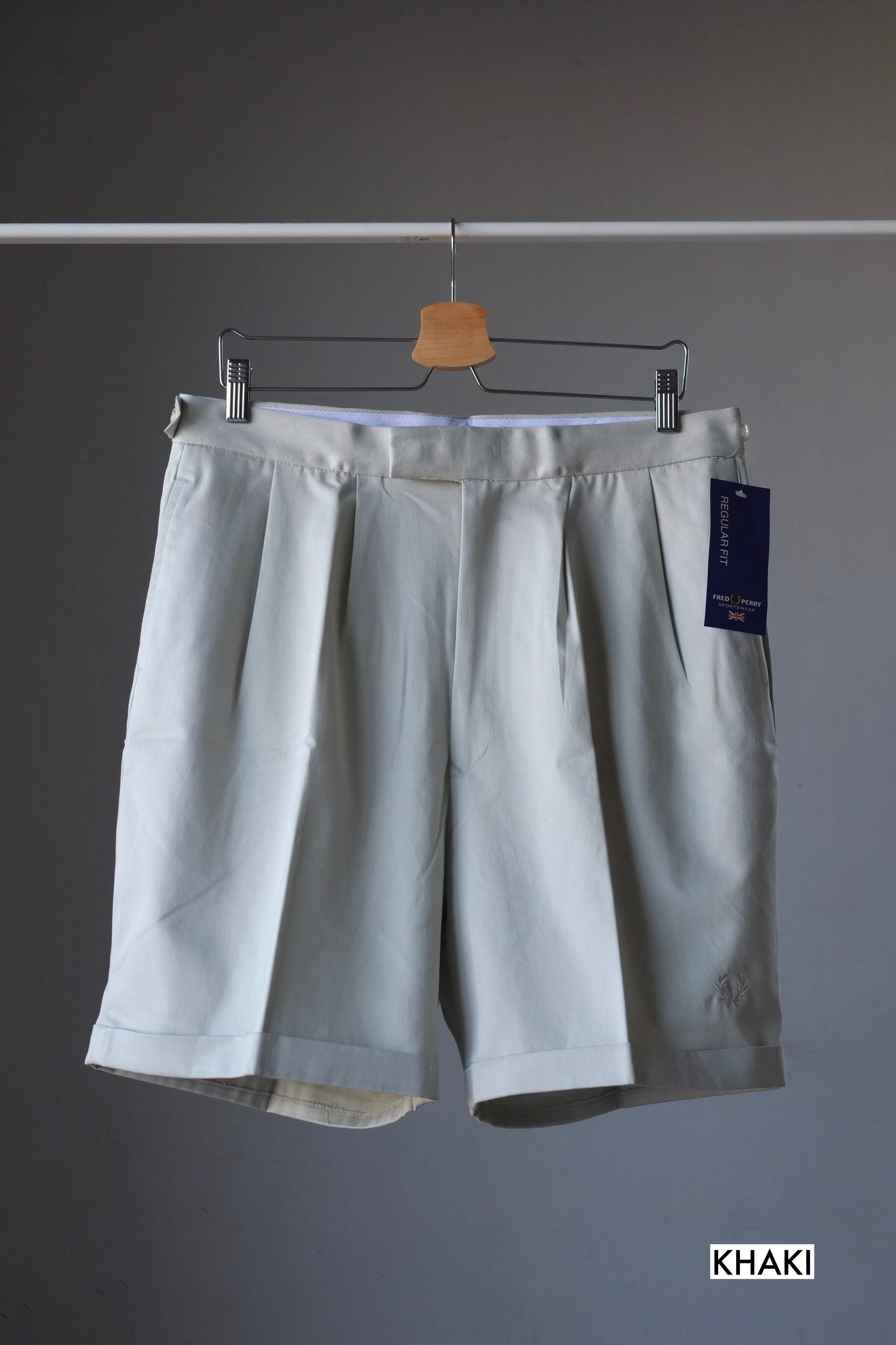 Vintage 90s Fred Perry men's bermuda shorts. Cotton twill dress shorts with 2 side slanting pockets and one back pocket, and featuring the embroidered laurel wreath logo. With a zipper closure and hook and bar fastening, and pleats along the waist resulting in a wide leg cut, adjustable buttoned straps on the waist make for a comfortable fit and size.