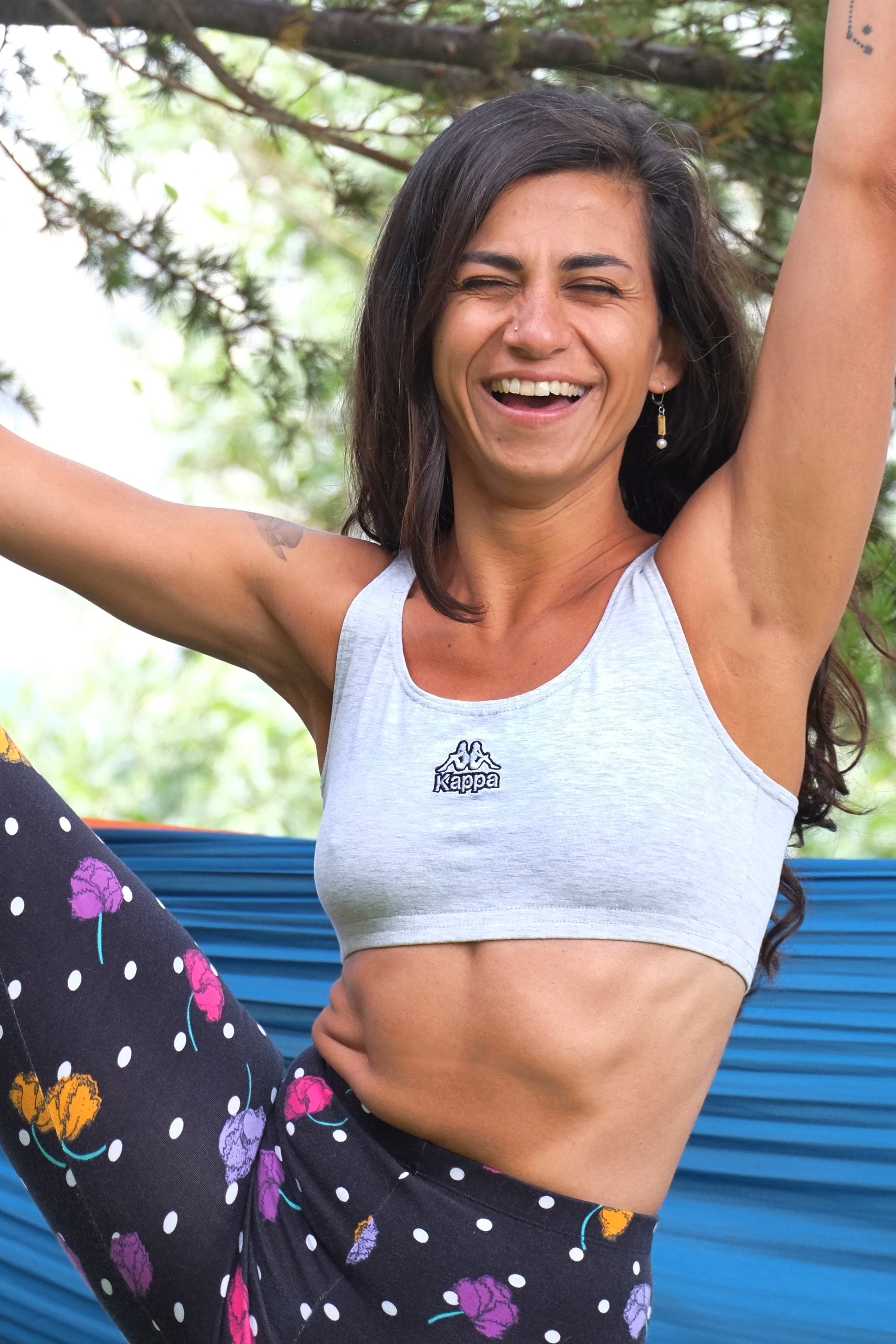 Vintage 90s workout sports bra, aerobics and dance bra. Embroidered Kappa on the front, ribbon logo across the back. Racer-back shape gives ease of movement and comfort.