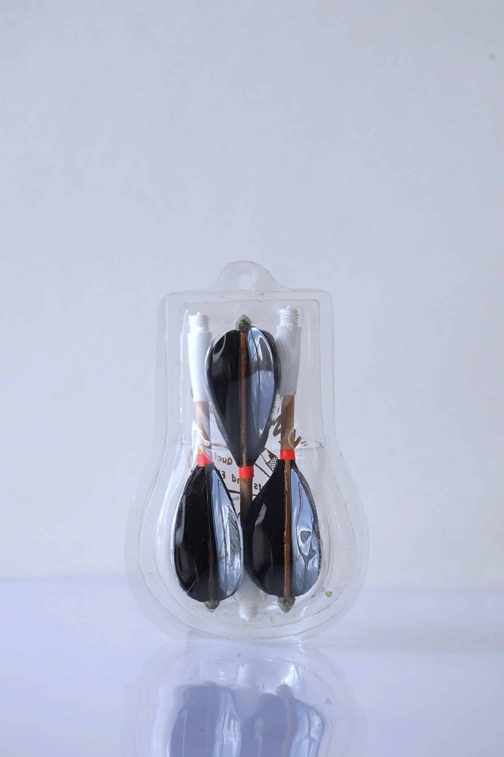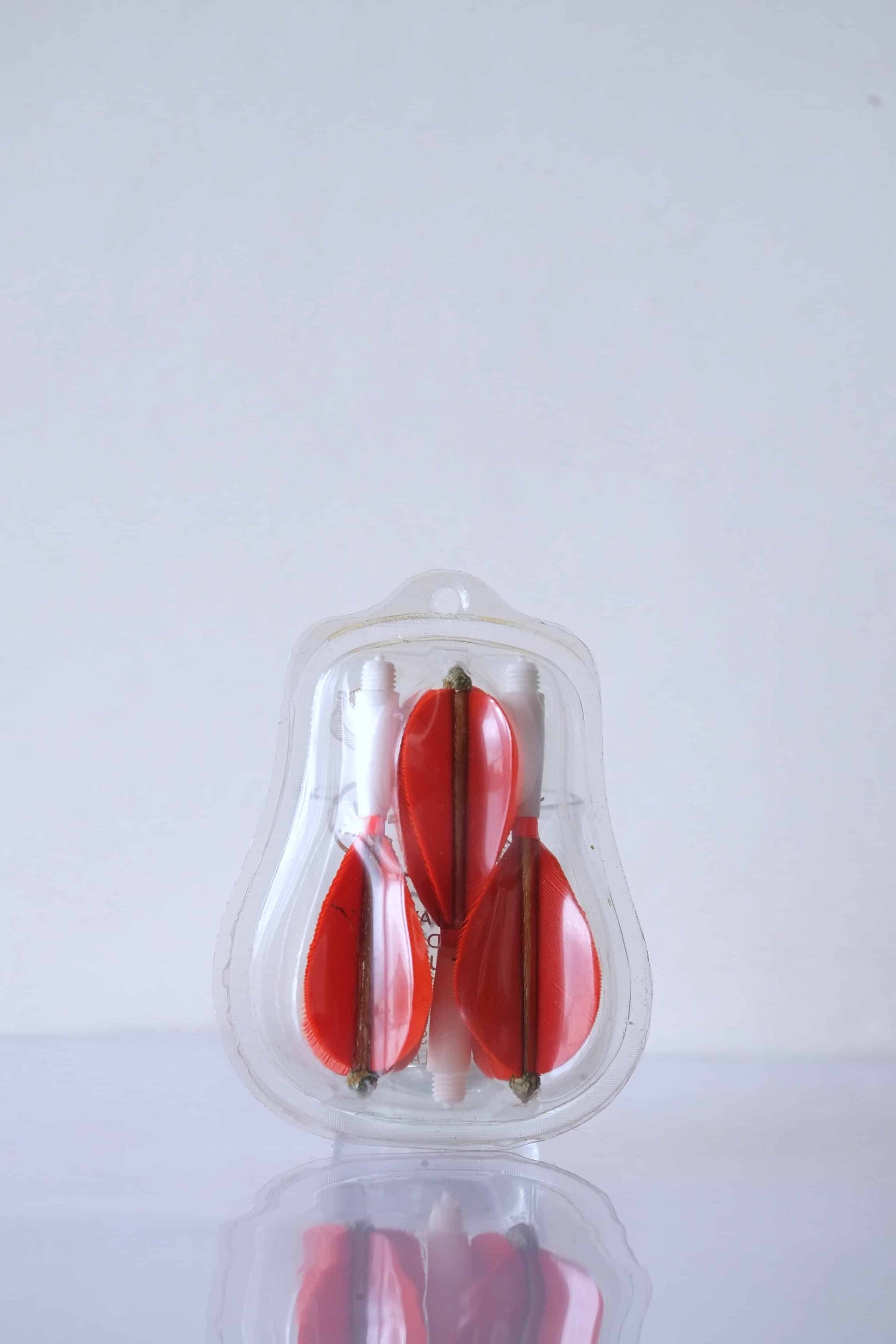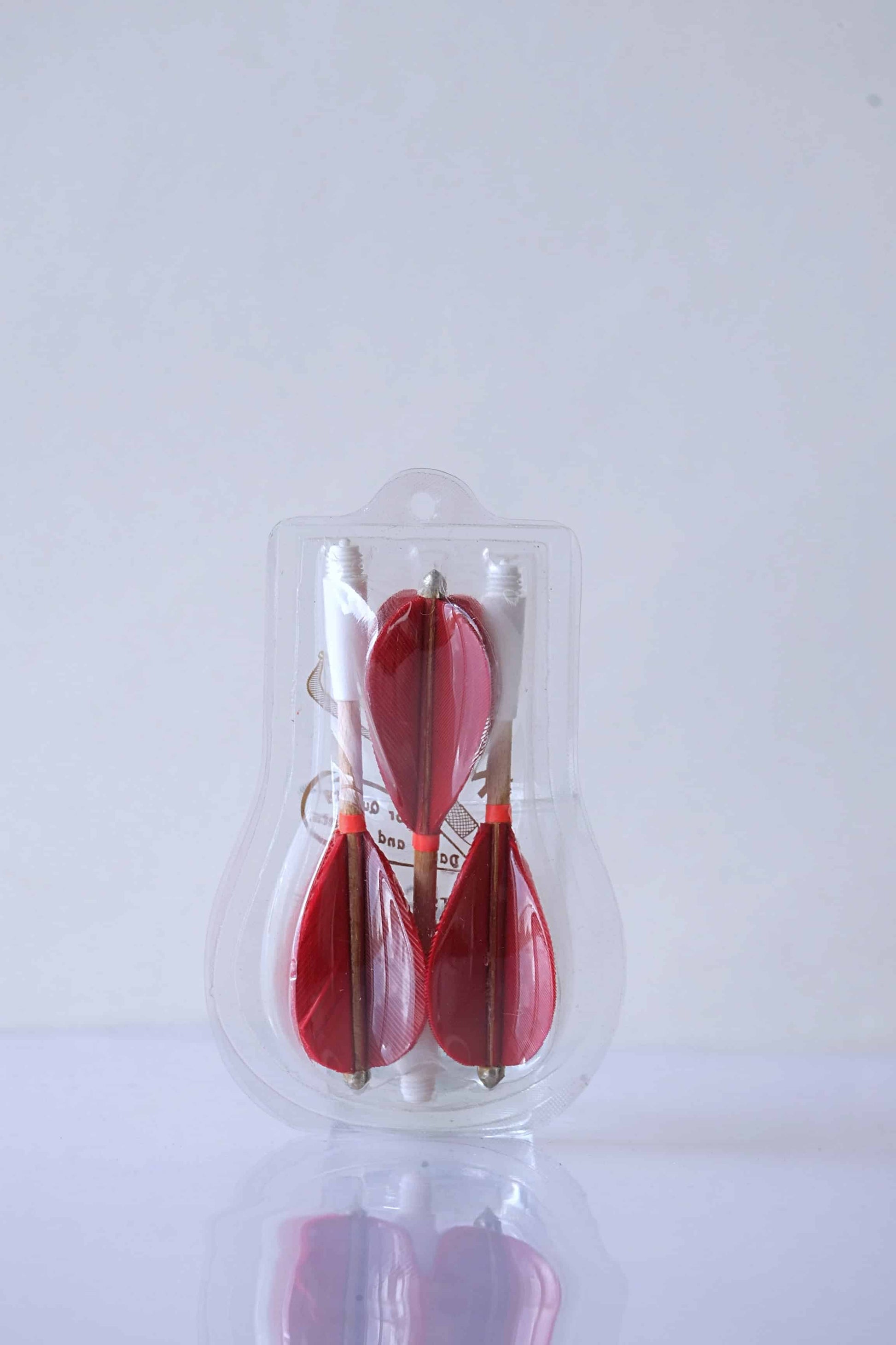 1980s sets of 3 flights made from feather and wooden stems. Available in various lengths, colors and shapes. (D5 = Delta shaped 5 inches).