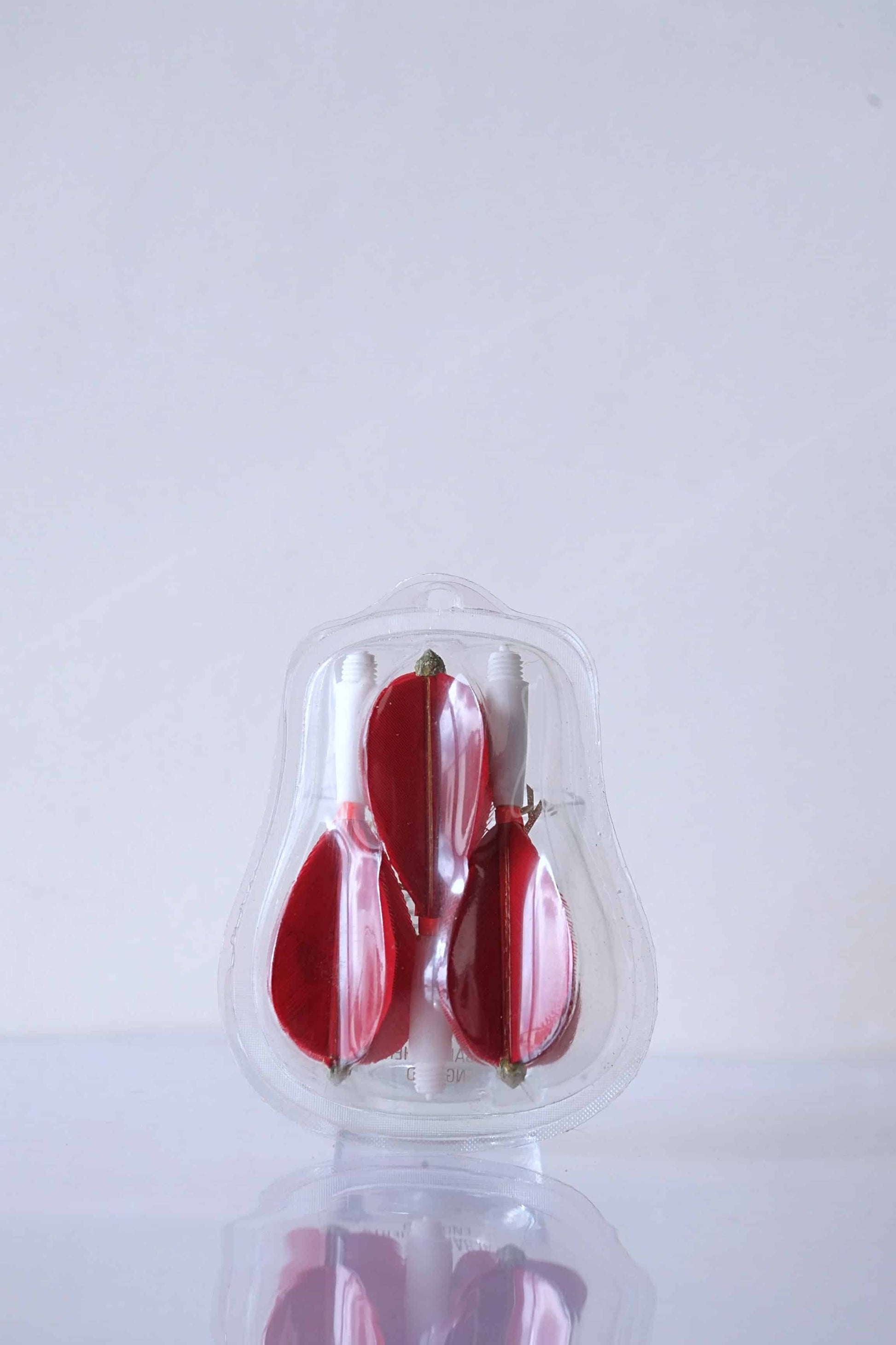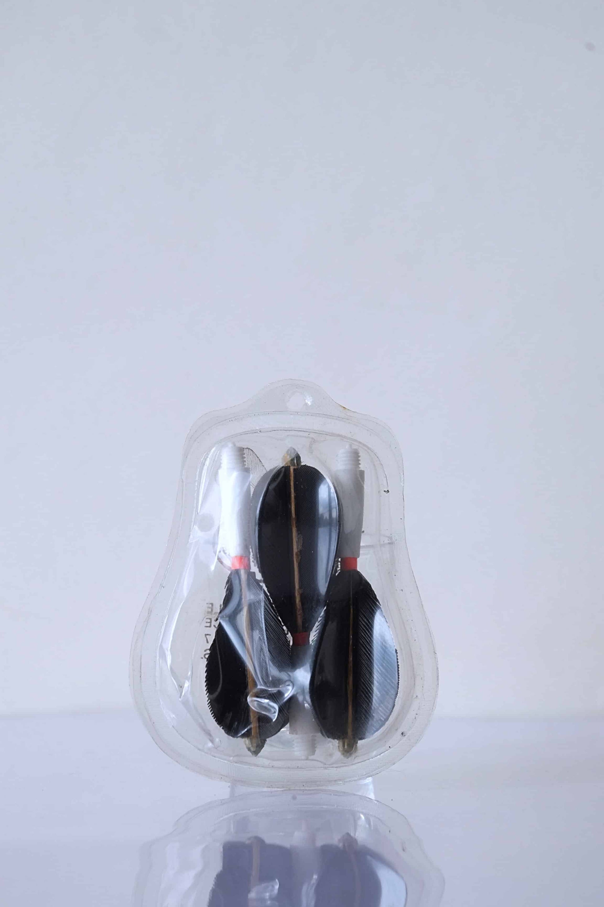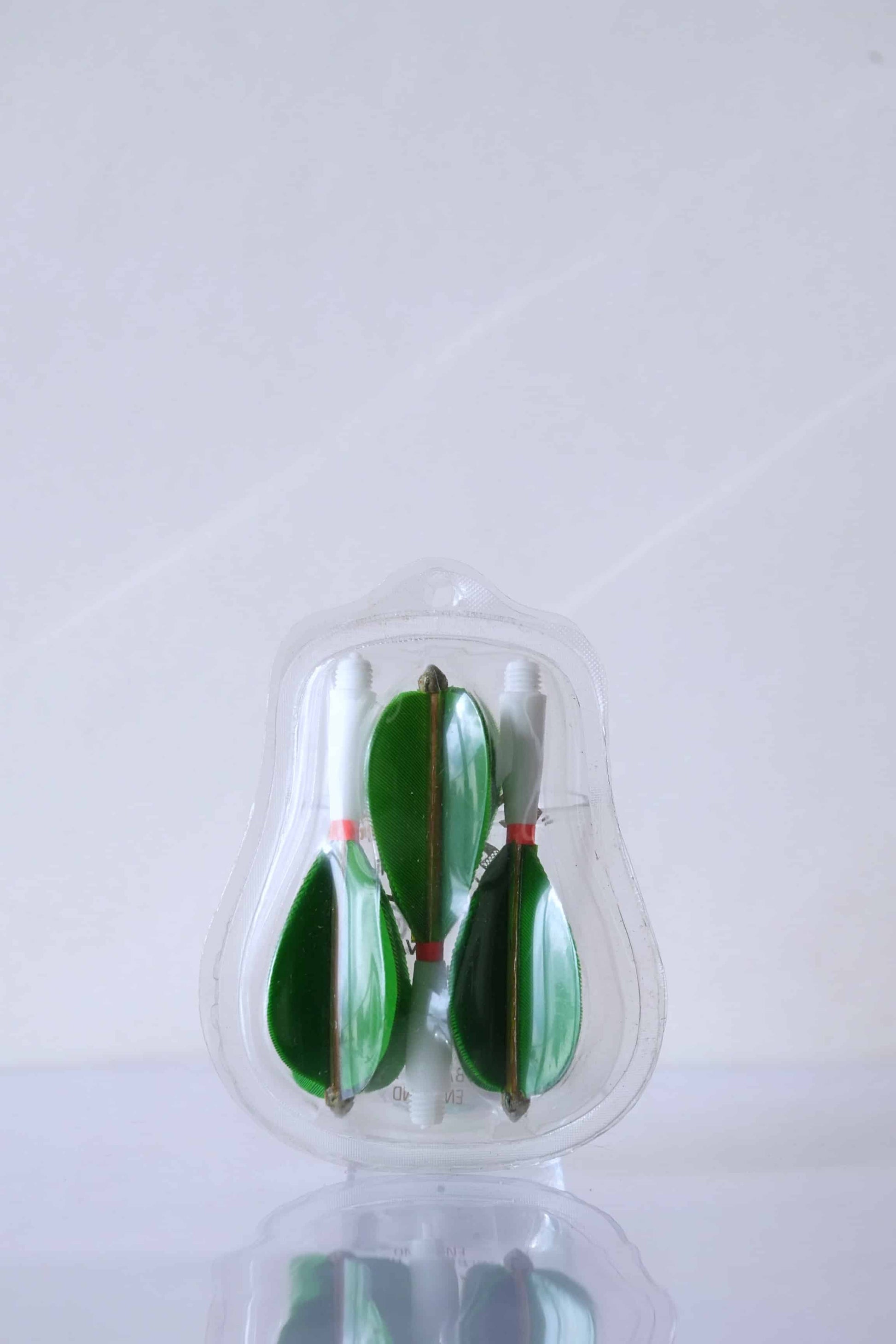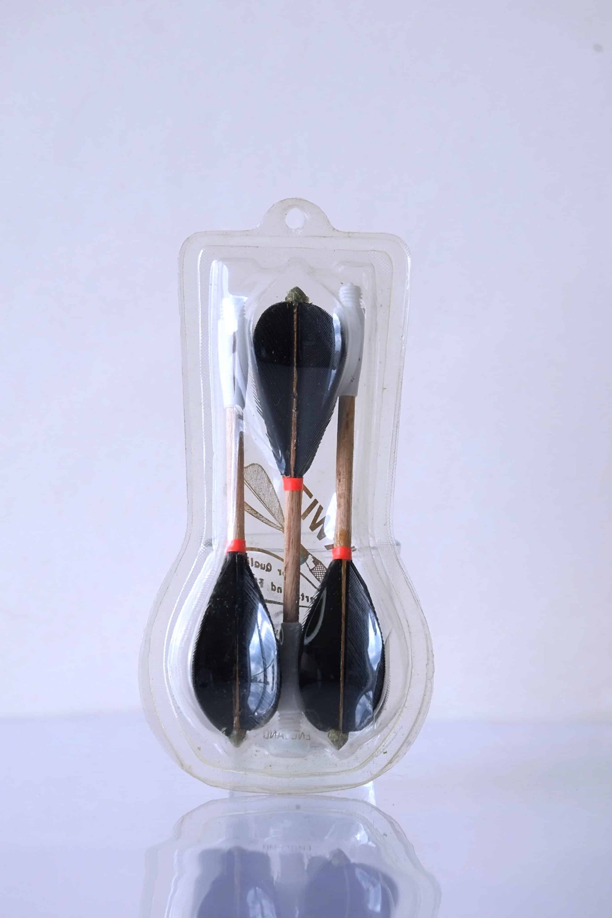 1980s sets of 3 flights made from feather and wooden stems. Available in various lengths, colors and shapes. (D5 = Delta shaped 5 inches).