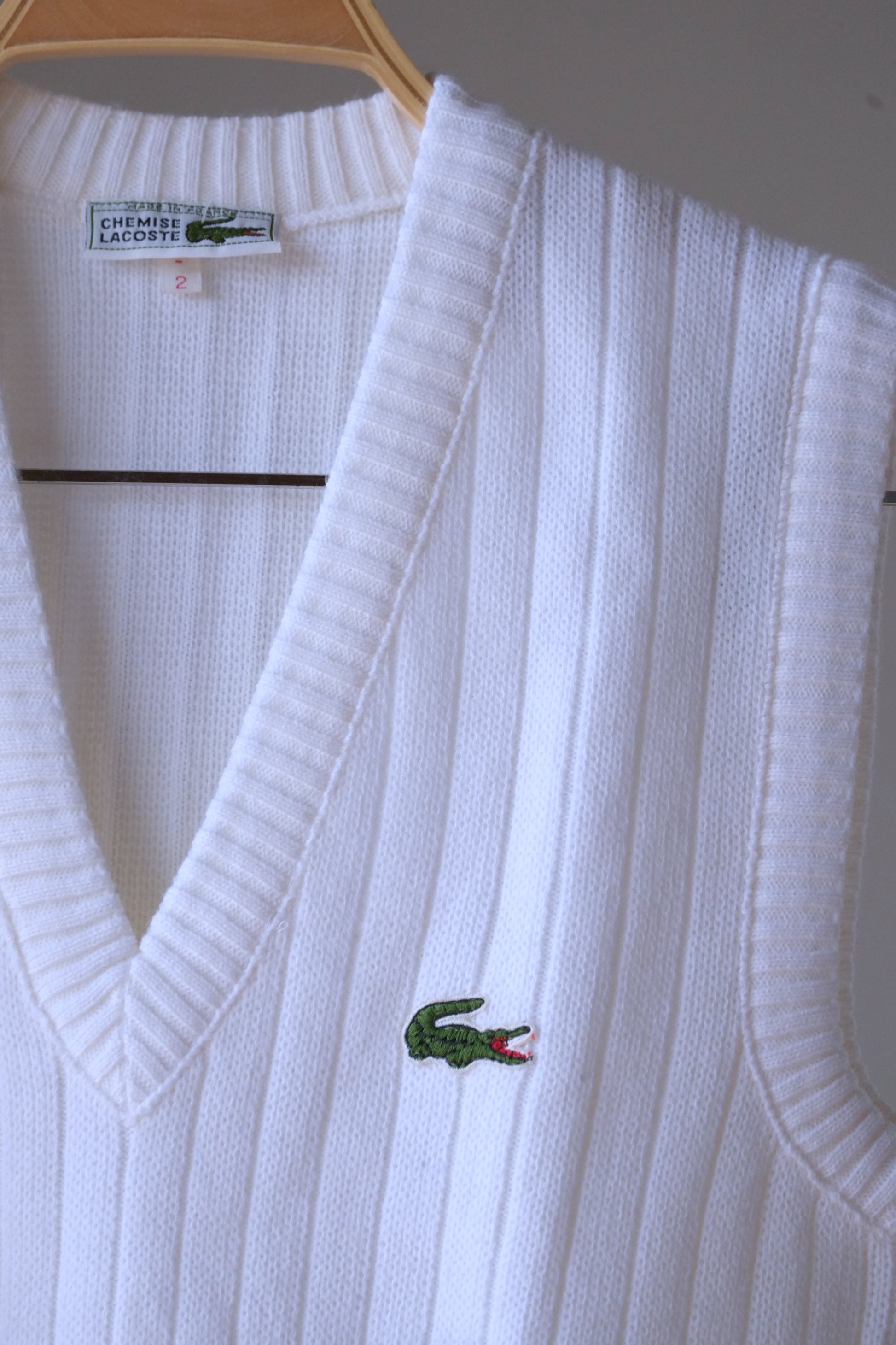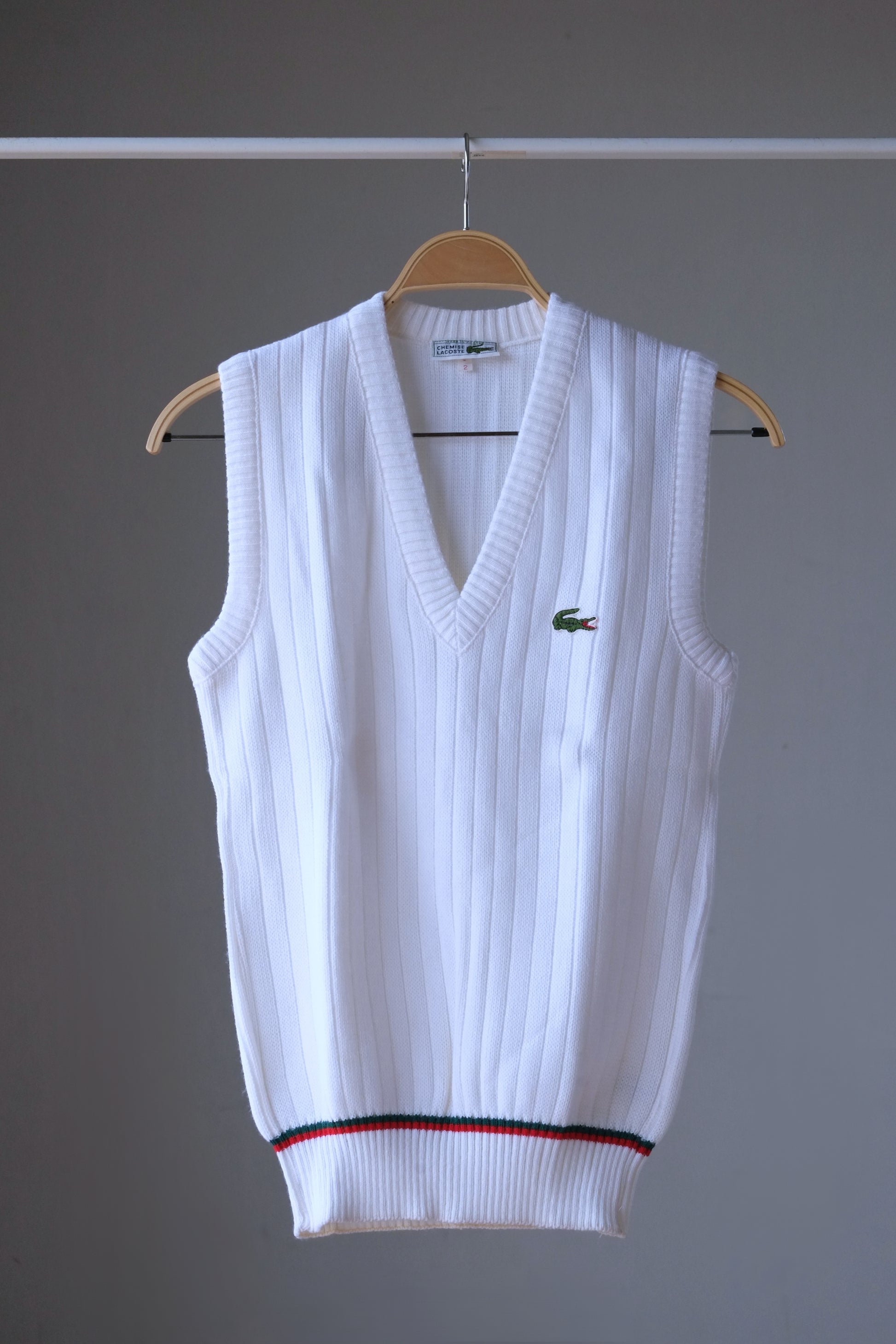 Vintage late 70's Lacoste sweater vest. Ribbed knit with a 2 stripe red and green detail on the waist cuff.