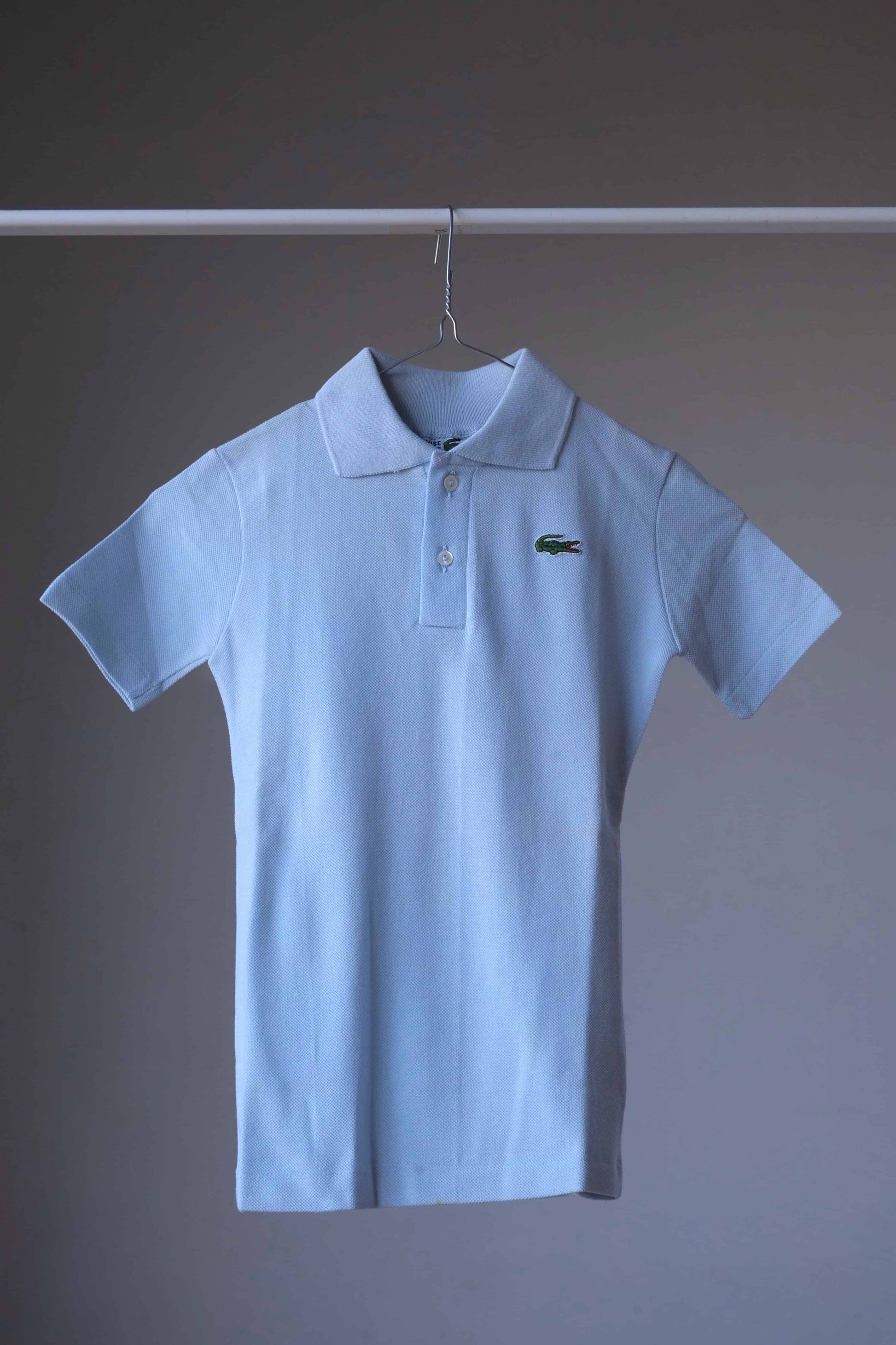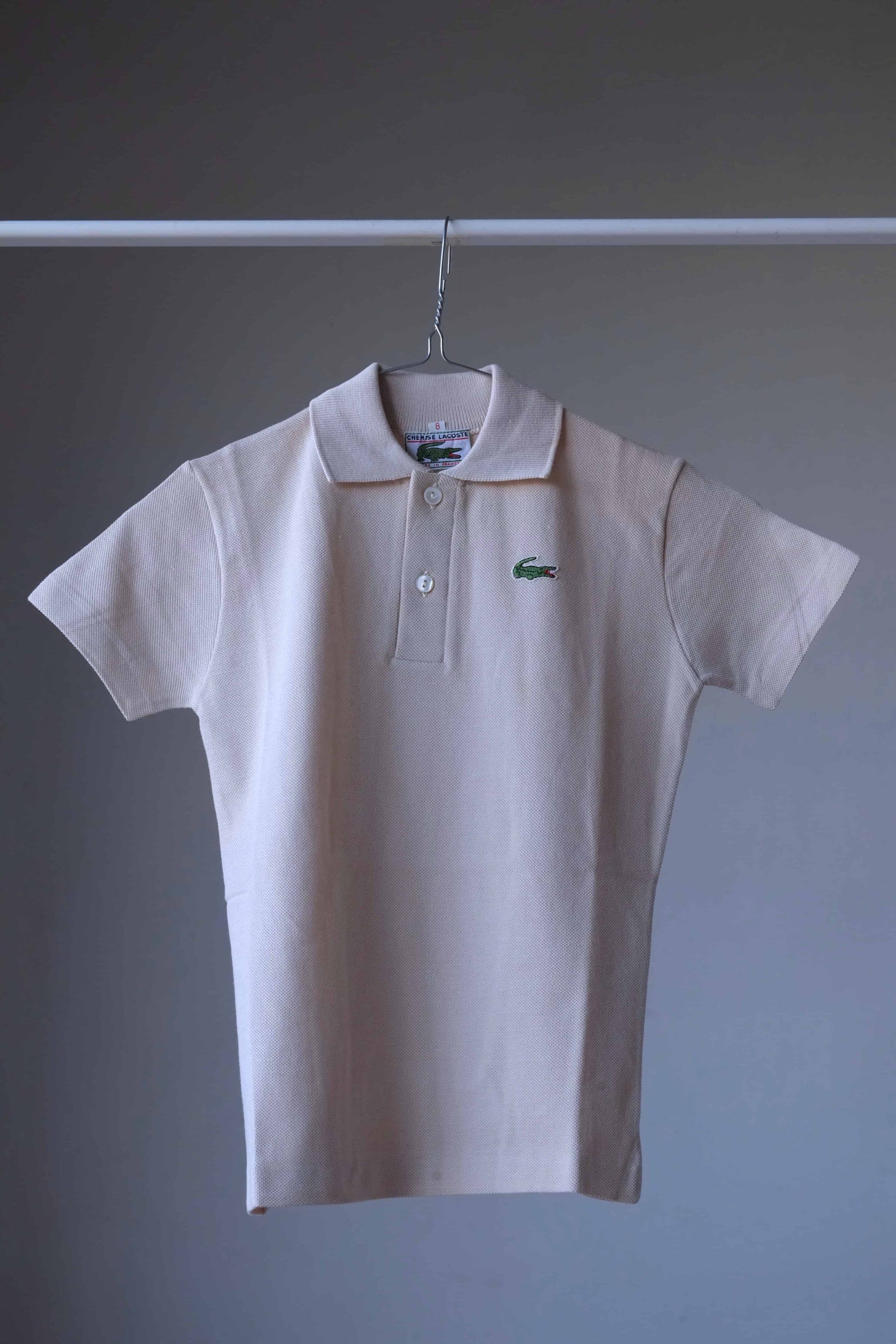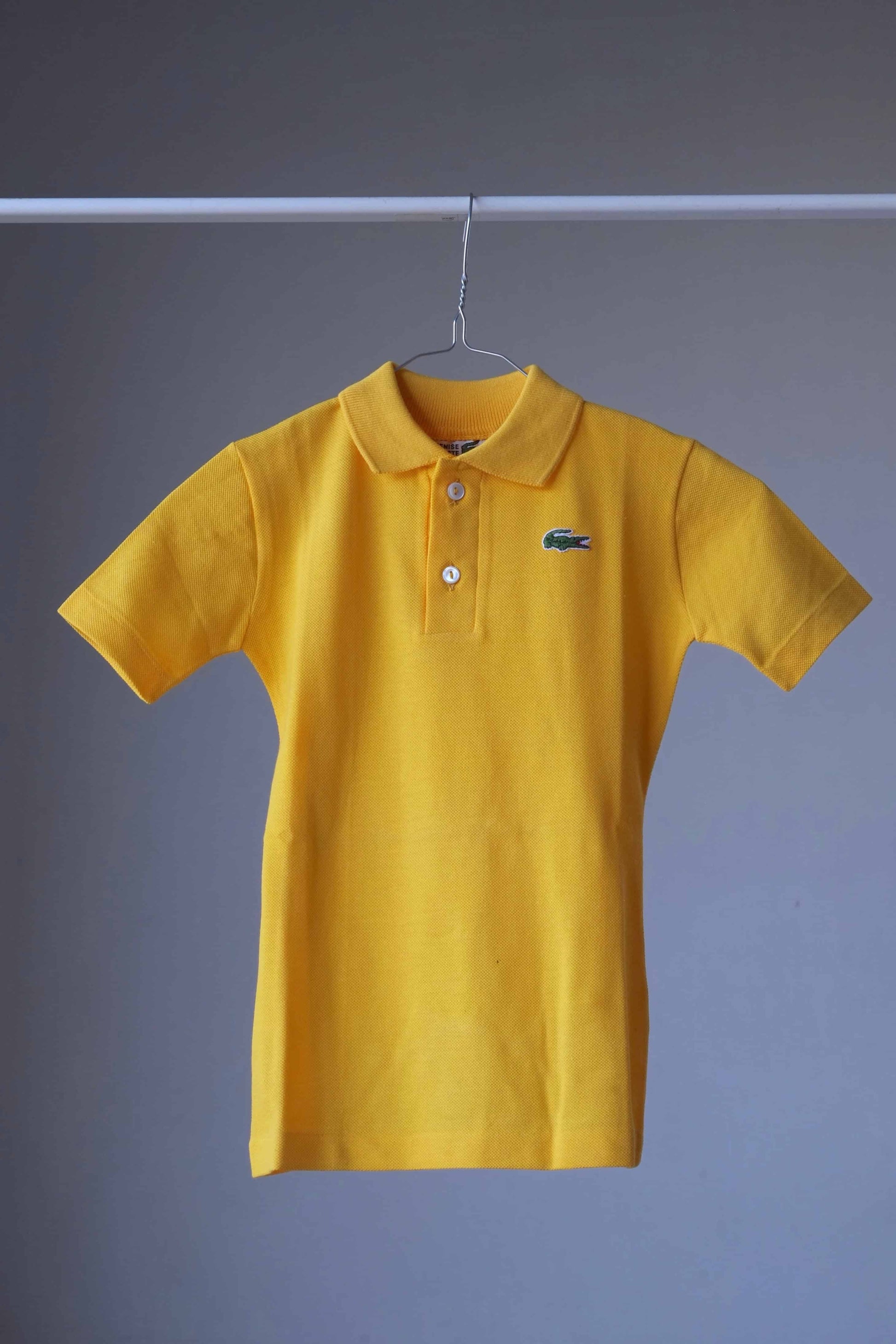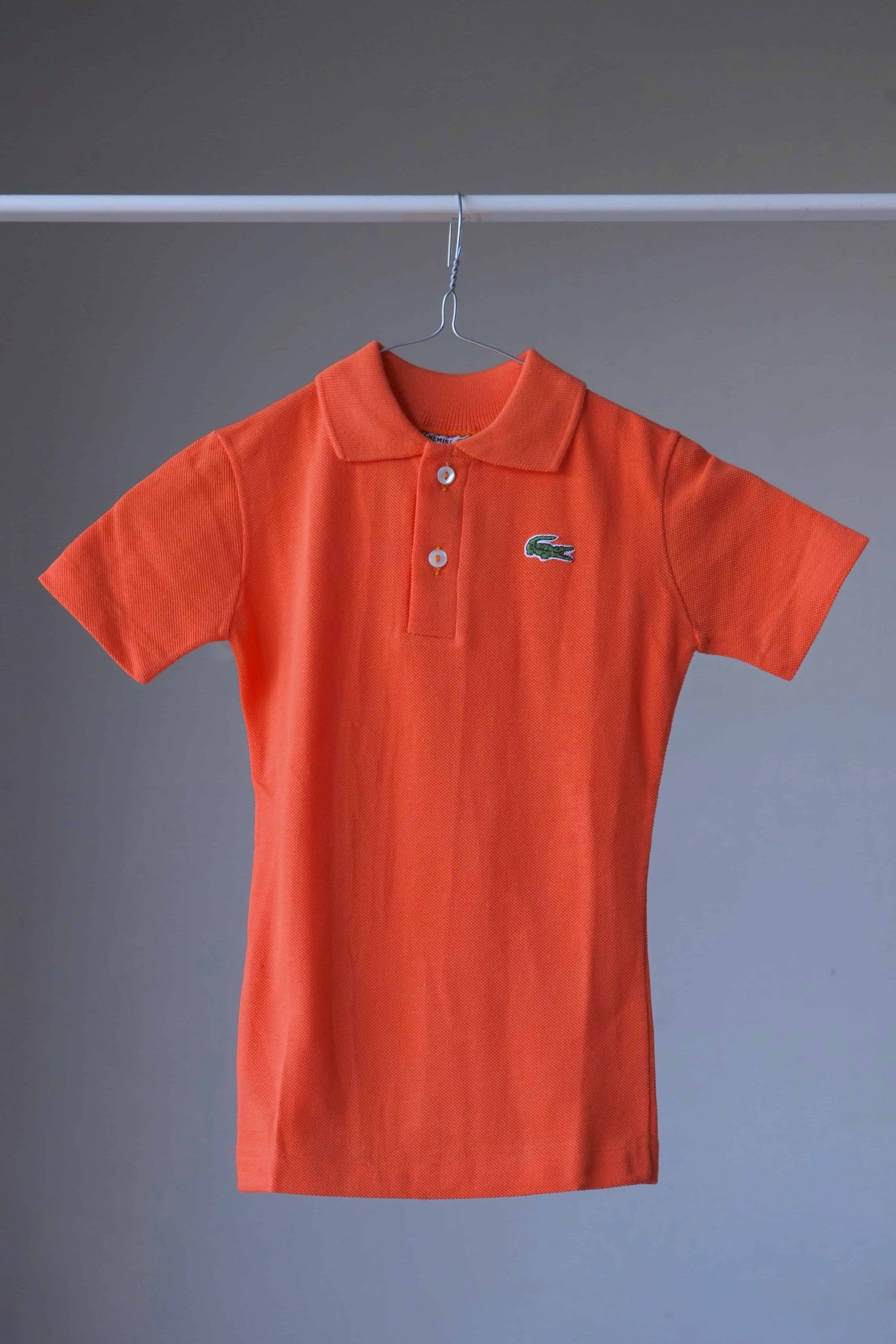 The Charivari Lacoste classic polo is from the late 70's and designed for kids. It comes in 4 solid colors, dusty light blue, beige, canary yellow and a cheery orange.