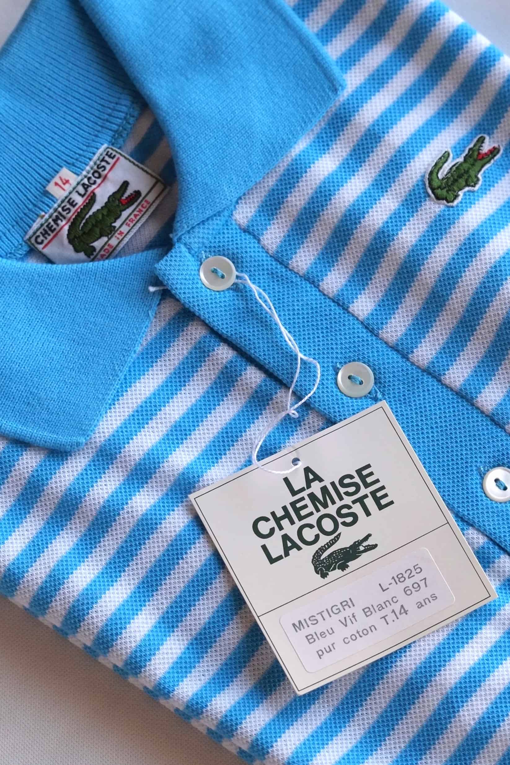 Vintage Lacoste kids polo from the early 1980's. The Mistigri polo boasts flattering bright blue stripes against a white background, with a classic cut that is tailored to the waist for a stylish fit.