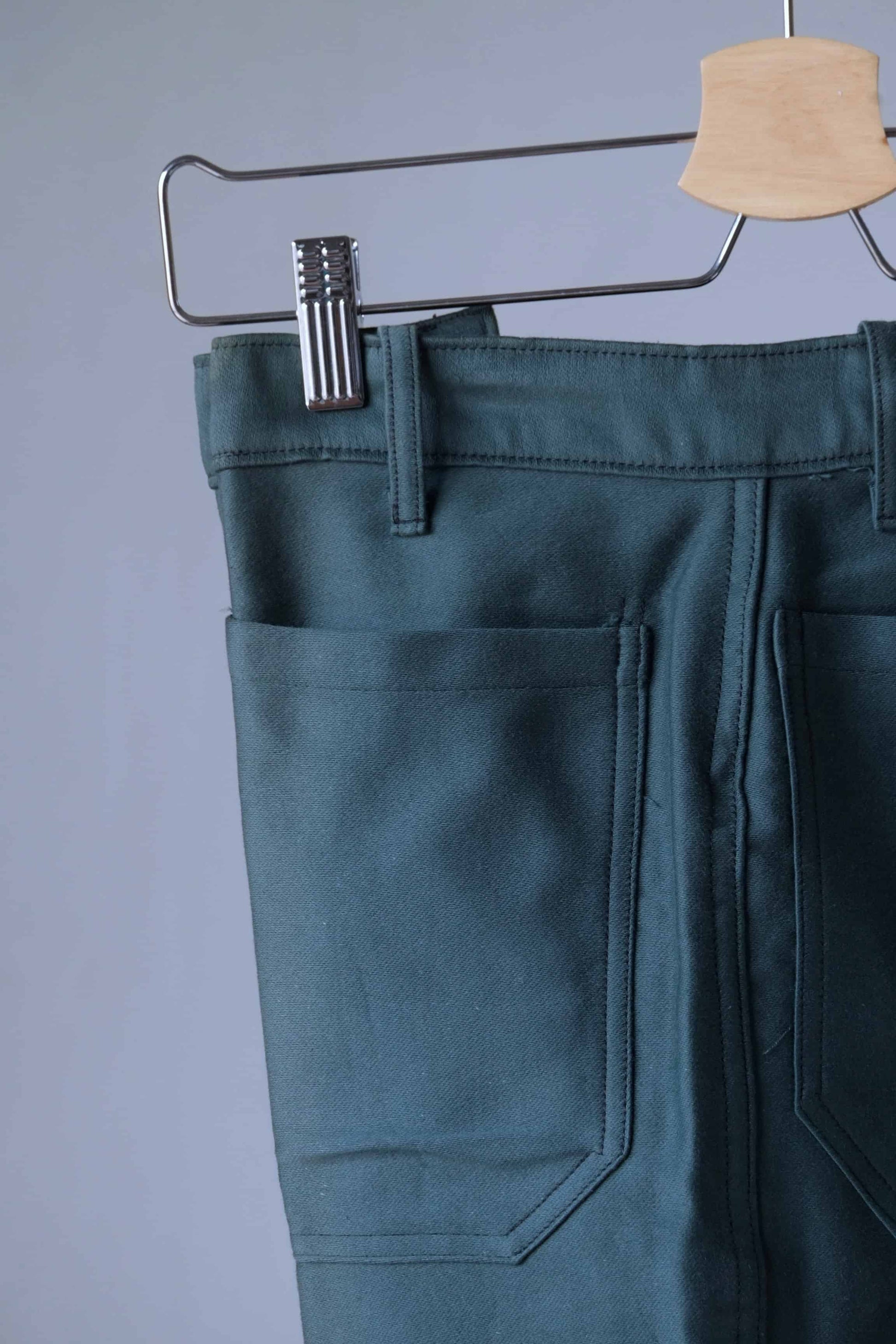 Vintage 70's wide leg pants. High waist in brushed denim with patch pockets in the front, and front leg center crease. Size 44 in Dark Green shows subtle fading along the folds, as pointed out by the arrows in the photos. Size 44 in Brown has a thread imperfection on the back of the left leg.