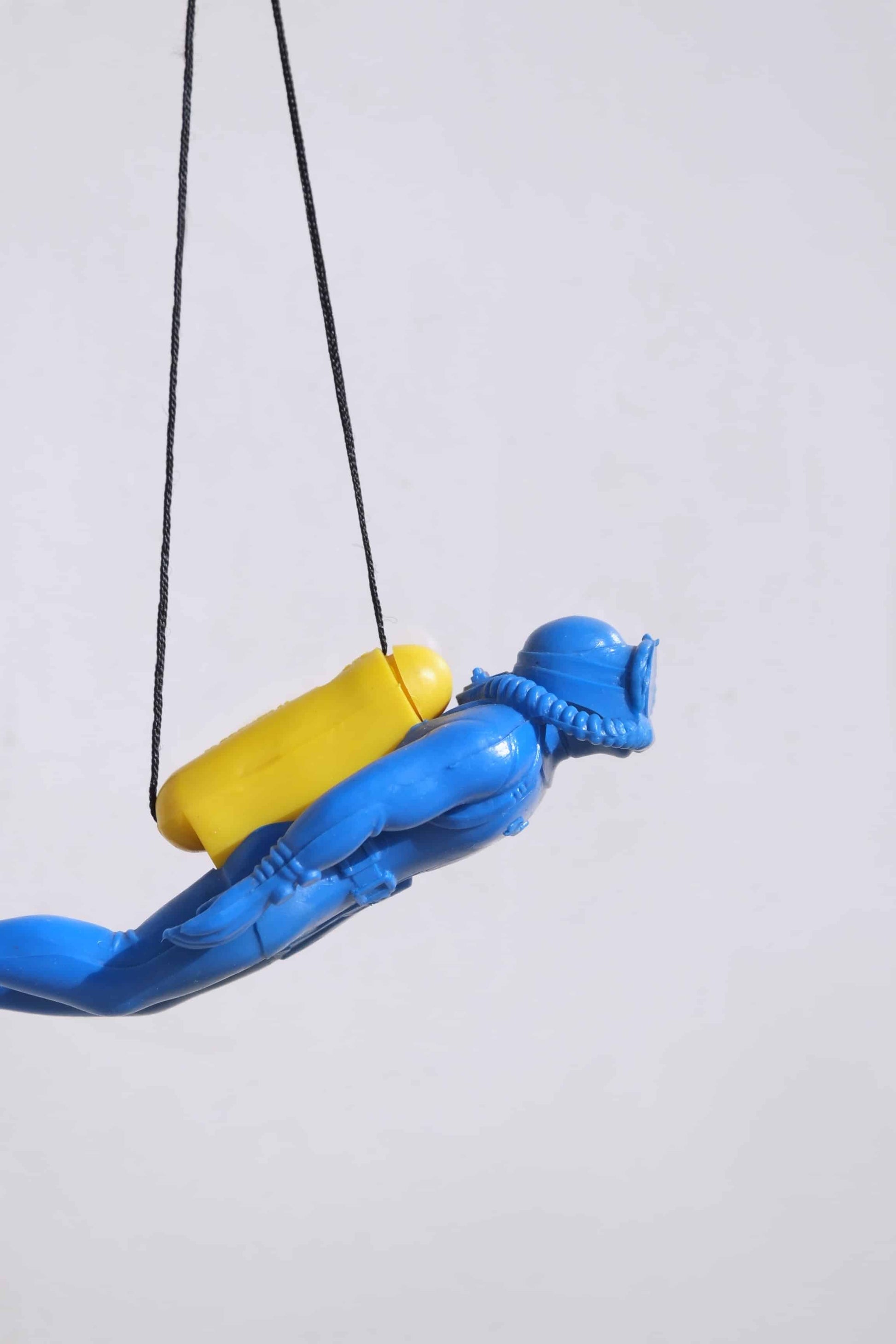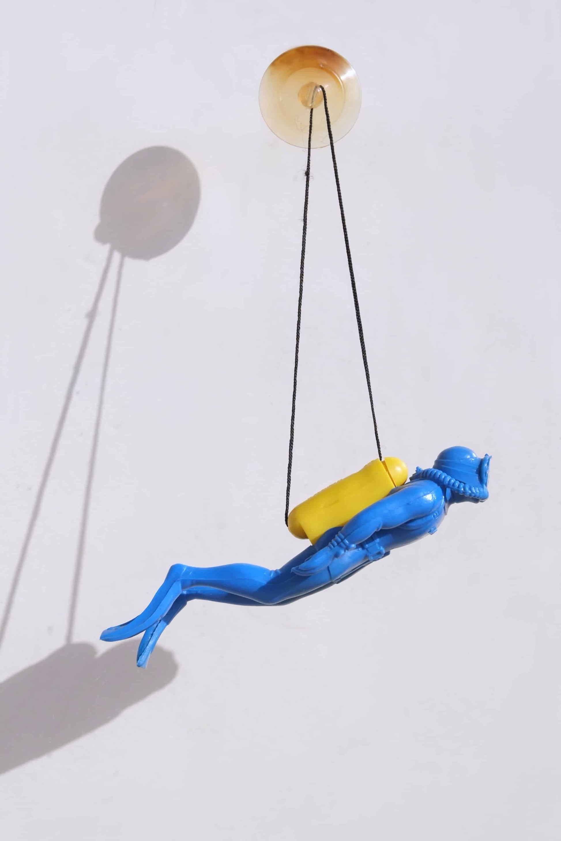 This 1980's vintage Nemrod memorabilia is a hanging figurine of diver suspended by a string and suction cup. Designed to adorn car windshields, glass doors, mirrors, or walls, it measures 14 cm in length, and the string measuring 13.5 cm (x2).