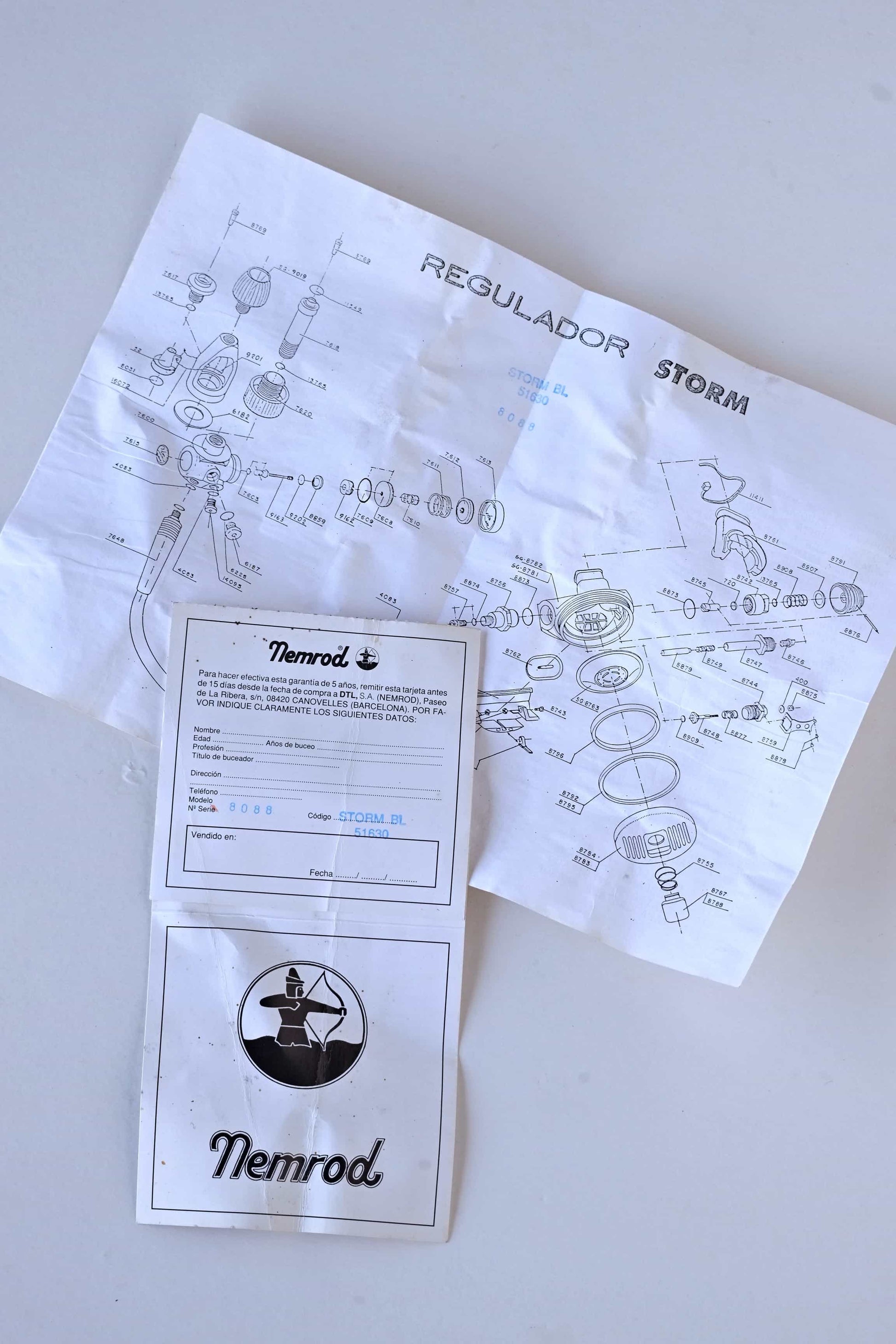 Nemrod Storm advanced scuba diving regulator from the early 90s, balanced piston and adjustable mouthpiece. Comes in handheld plastic box, includes booklet and guarantee card. New in box.