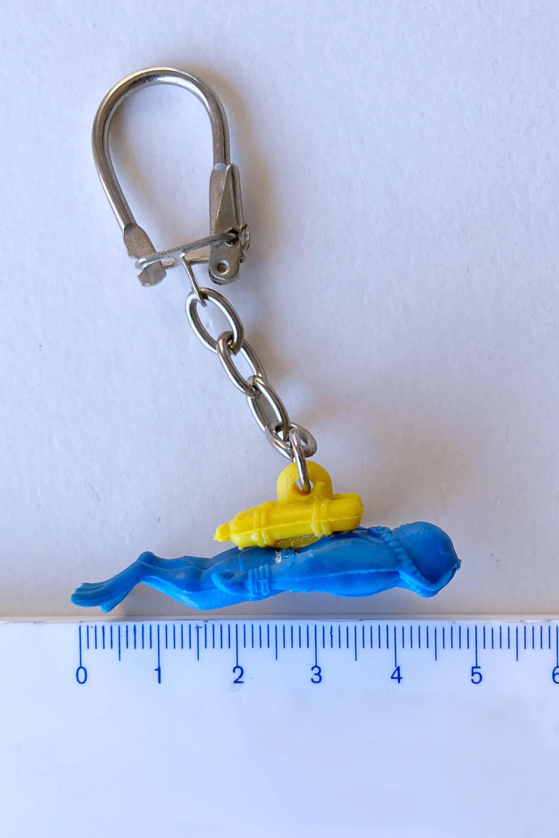 This keychain is a nostalgic relic from the 1980s, a rubber diver figurine by Nemrod. It measures 4.5 cm in length, while the chain and keyring extend to 6 cm.
