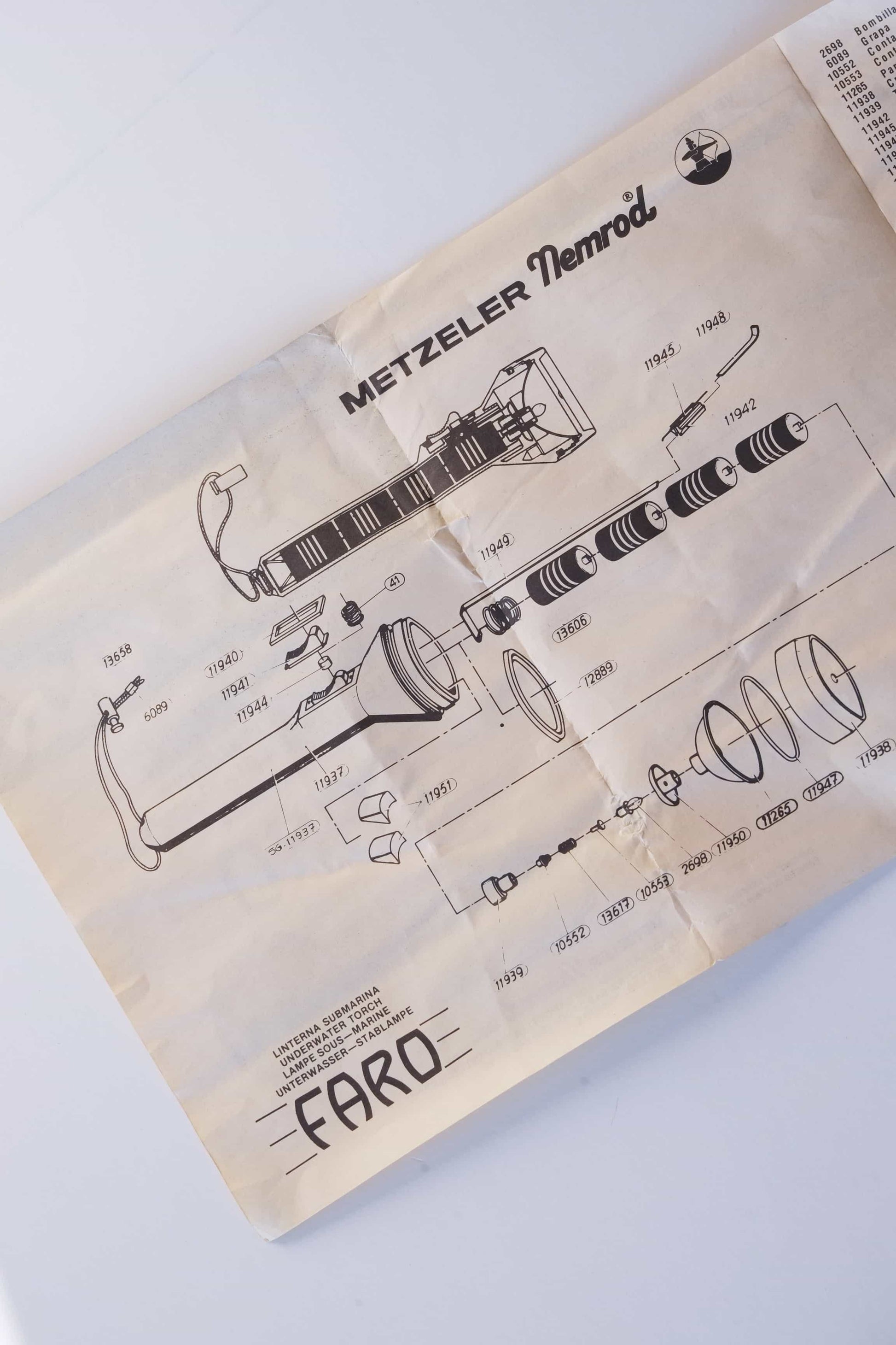 Nemrod Faro Light waterproof scuba diving flashlight. ABS plastic body, powered by 4 x D cells, magnetic switch, can be fitted with the new LED high power bulbs, circa 1990, new in packaging.