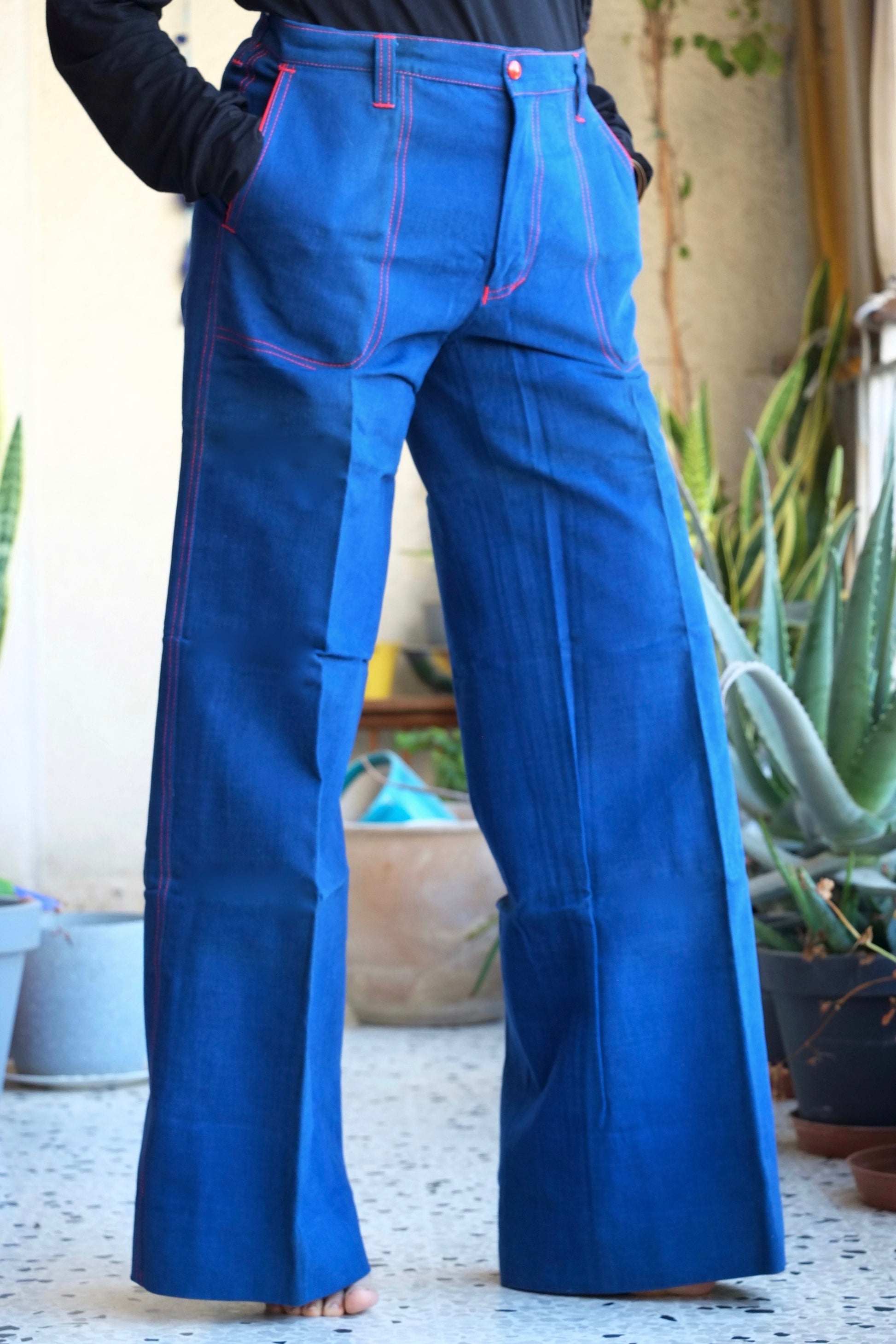 Vintage 70's pants in brushed denim. These wide leg vintage pants feature a red stitching border on the front pockets, the back waist inset, the belt loops, and the zipper closure flap. They have a front crease along the leg, and soft and thick brushed fabric in deep blue complimented by the red edging.