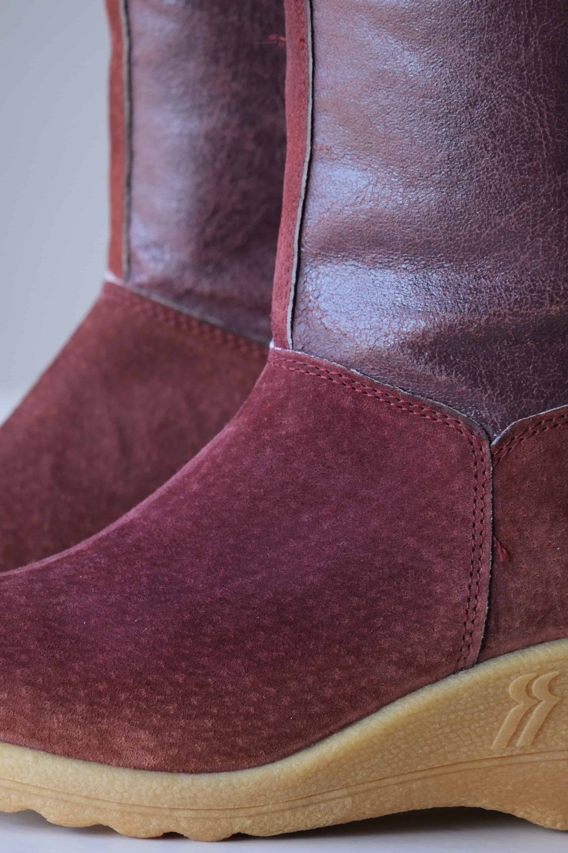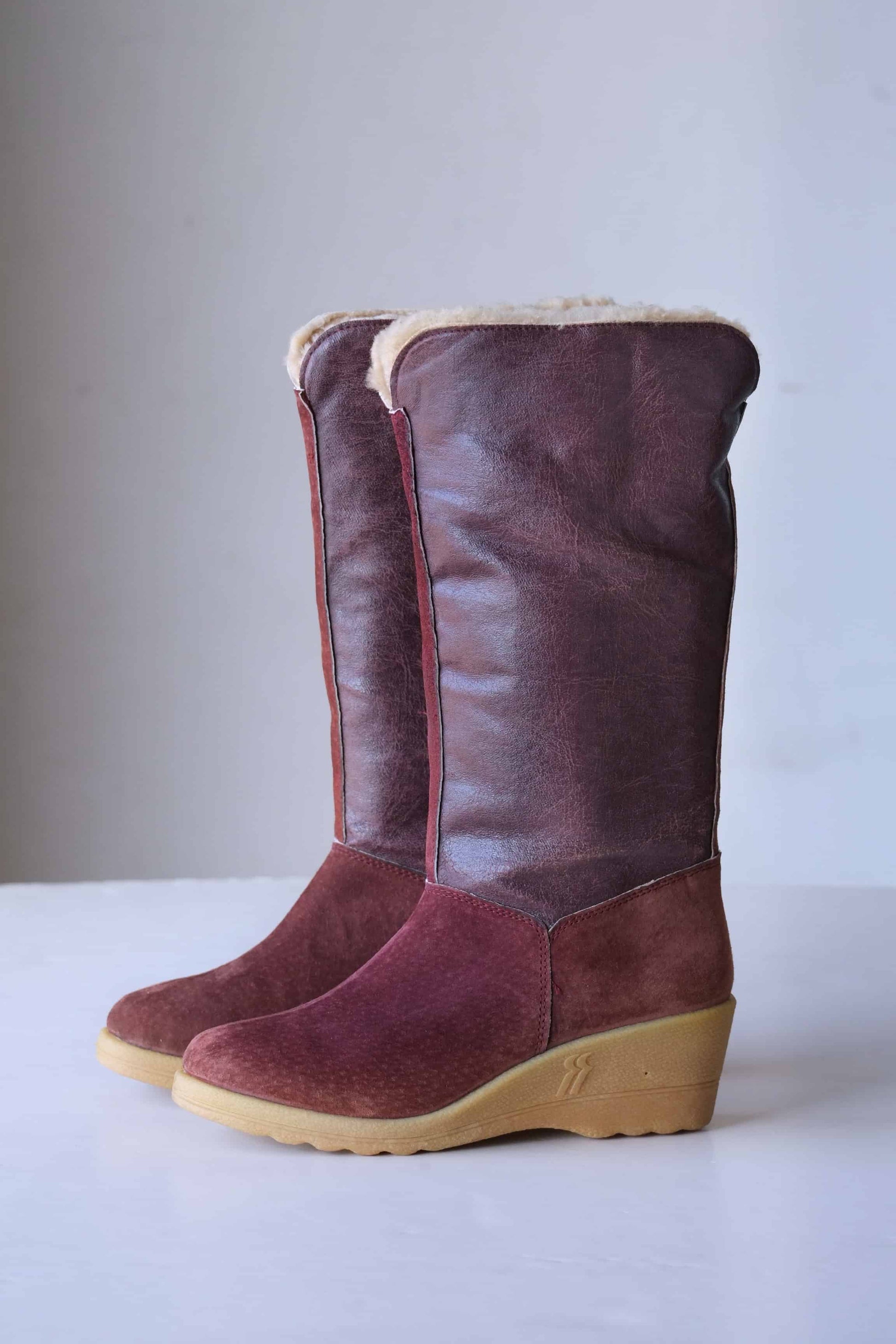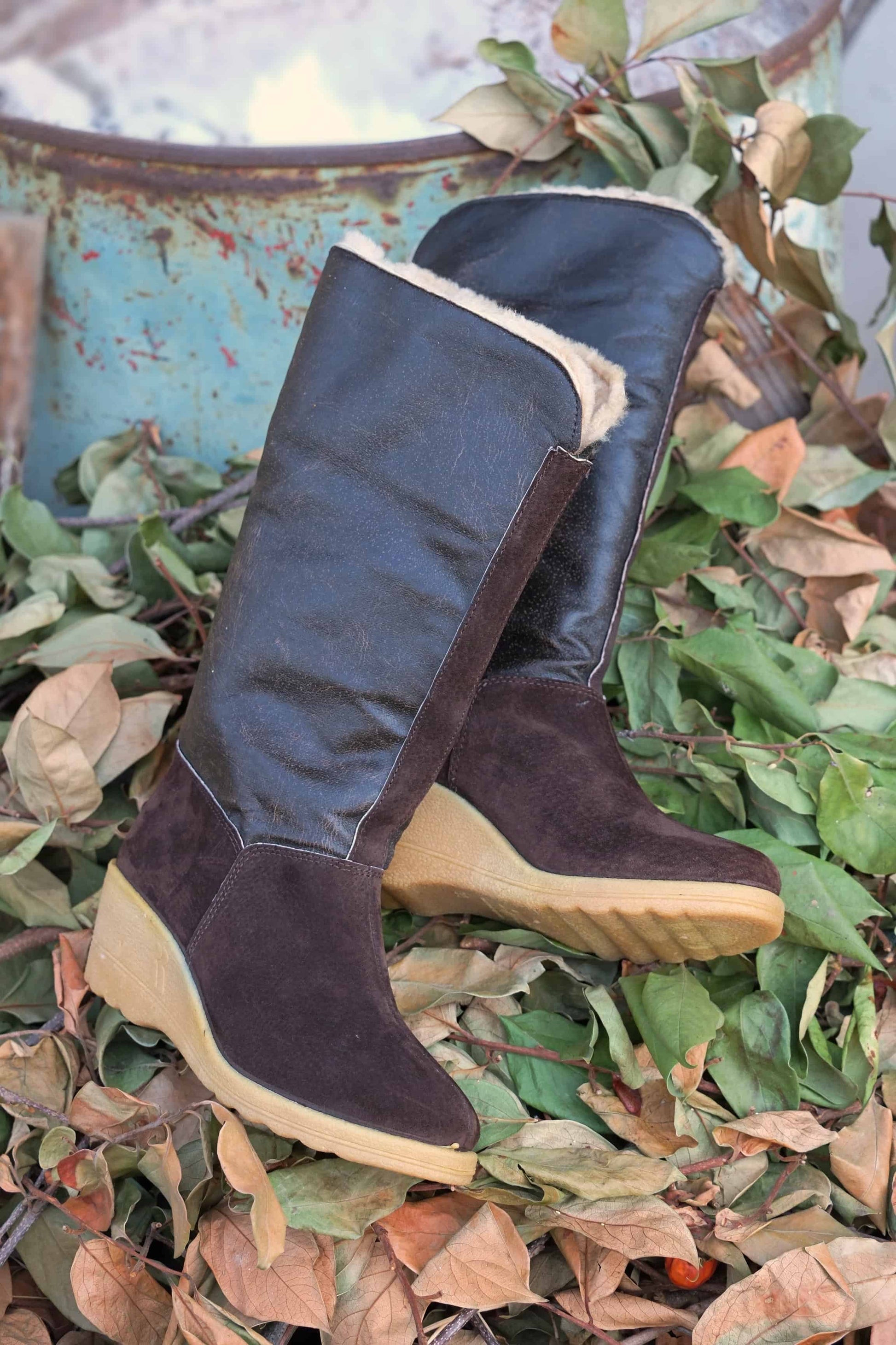 Vintage women's wedge heel boots from the late 70s and early 80s. Suede and leather exterior with 100% shearling wool interior. They keep the feet warm and dry, the crepe wedge heel is extremely comfortable. The exterior is water and snow resistant. These boots are great for daily wear in the city as well as in the snowy and cold mountains. A crepe sole is a completely natural product with extraordinary resilience that ensures unbeatable comfort.