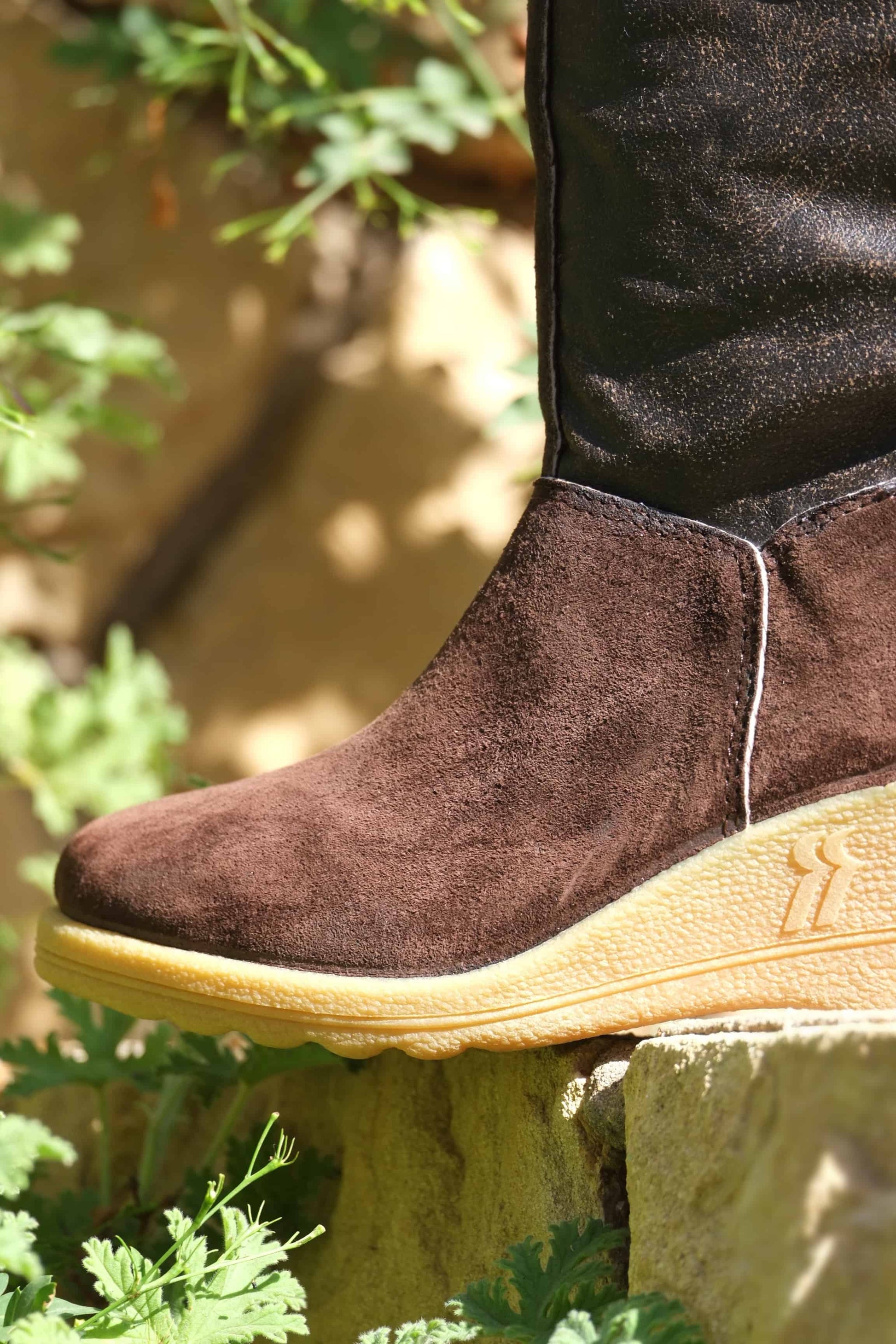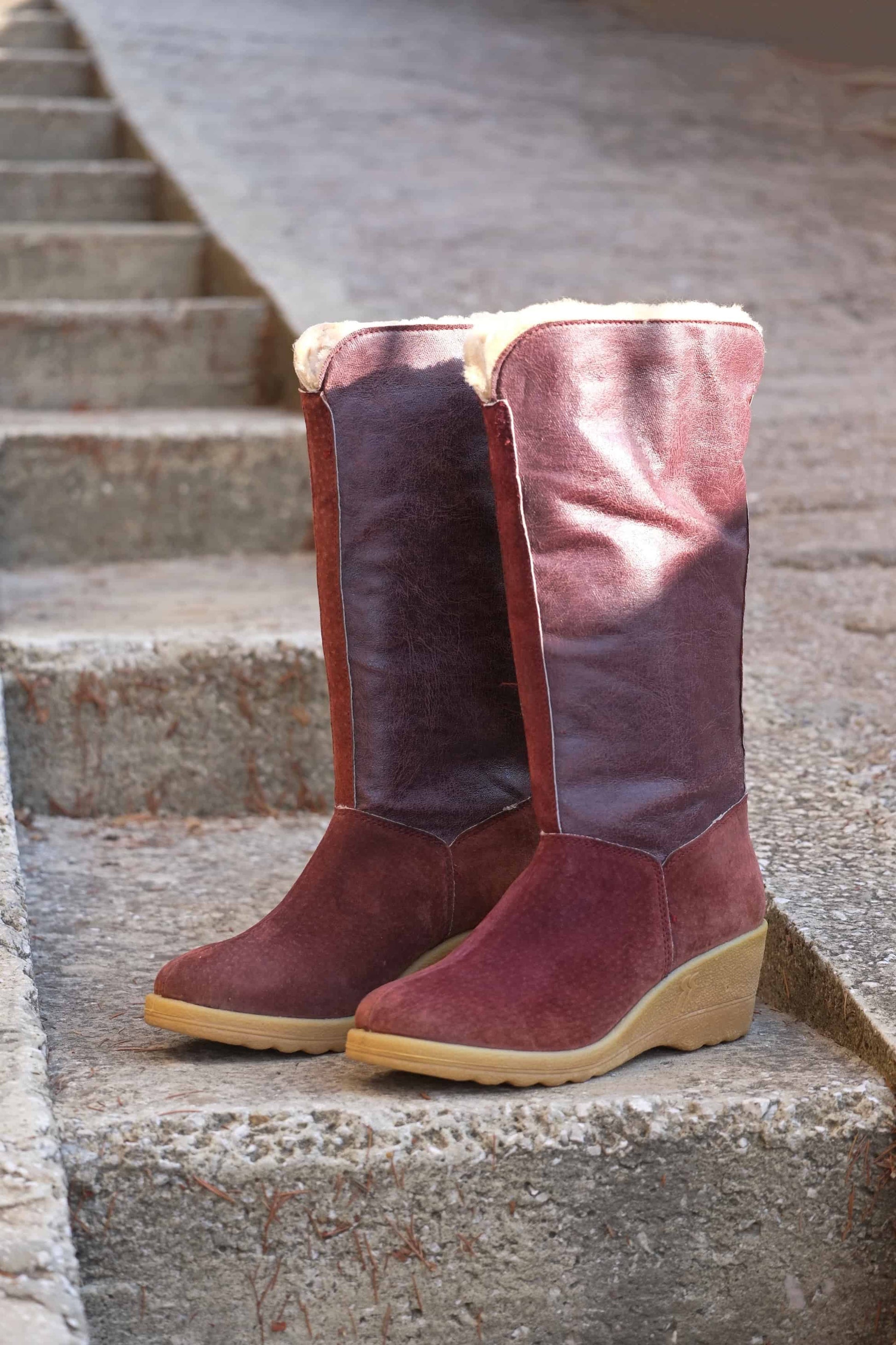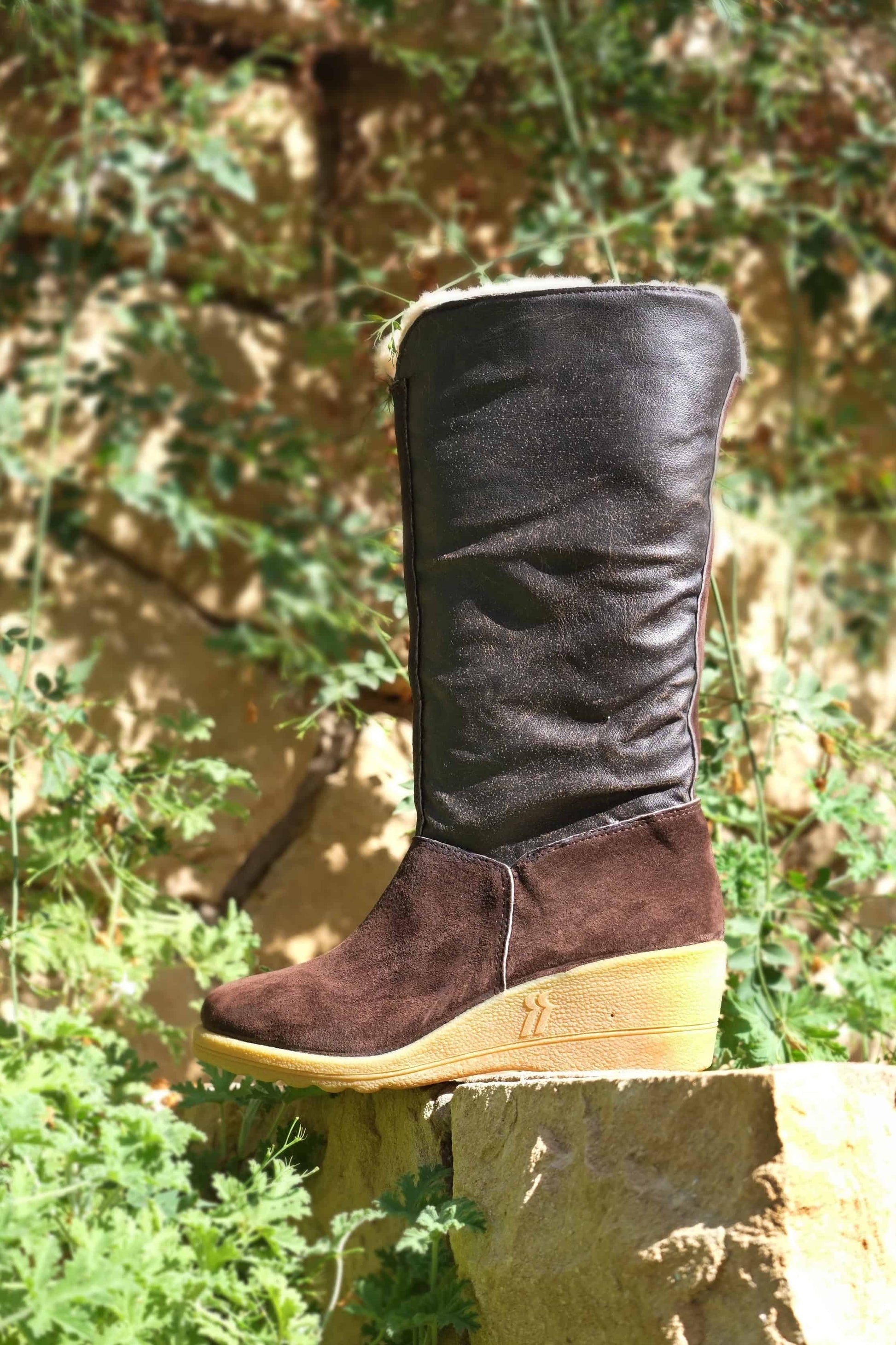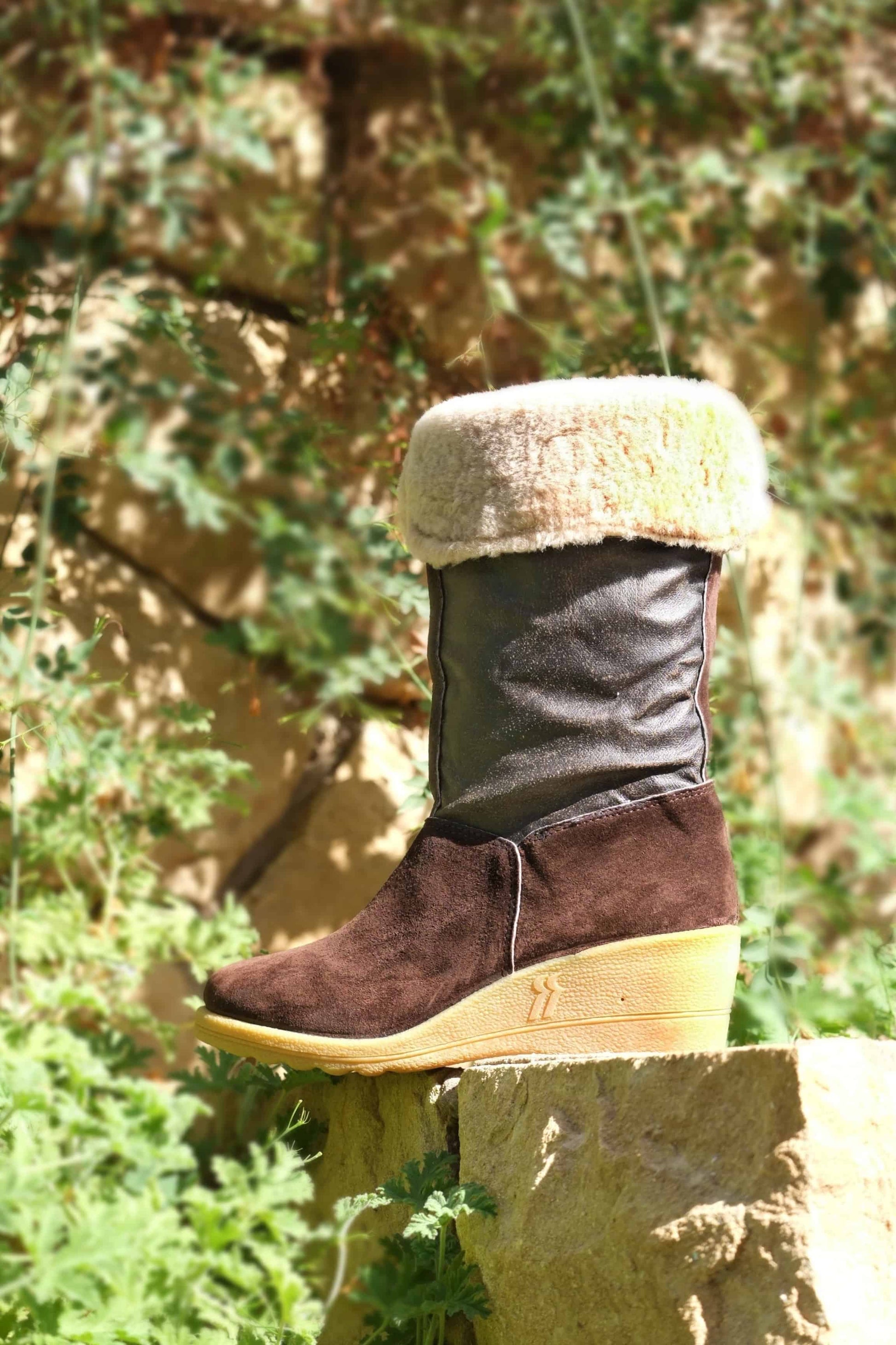 Vintage women's wedge heel boots from the late 70s and early 80s. Suede and leather exterior with 100% shearling wool interior. They keep the feet warm and dry, the crepe wedge heel is extremely comfortable. The exterior is water and snow resistant. These boots are great for daily wear in the city as well as in the snowy and cold mountains. A crepe sole is a completely natural product with extraordinary resilience that ensures unbeatable comfort.