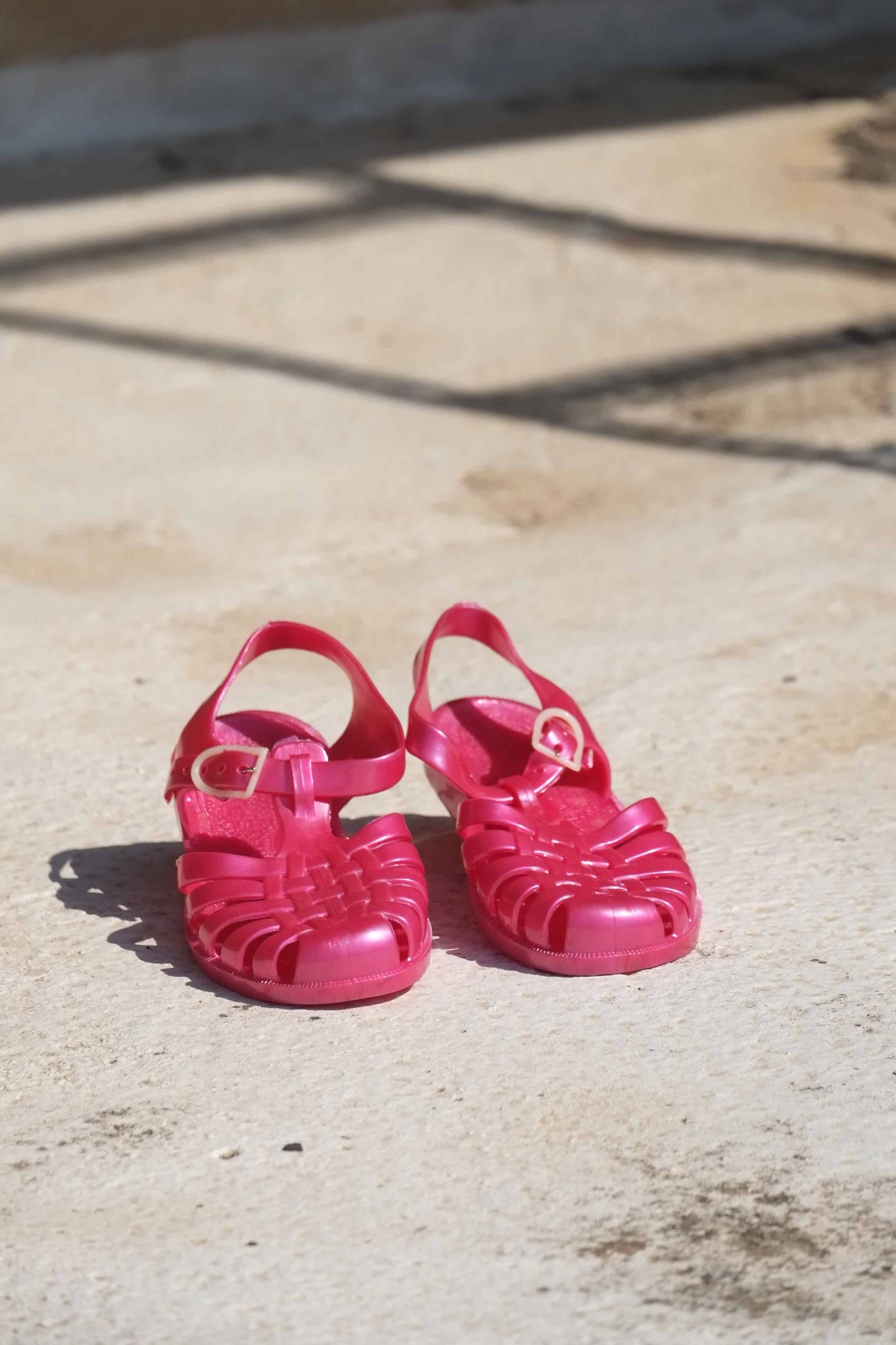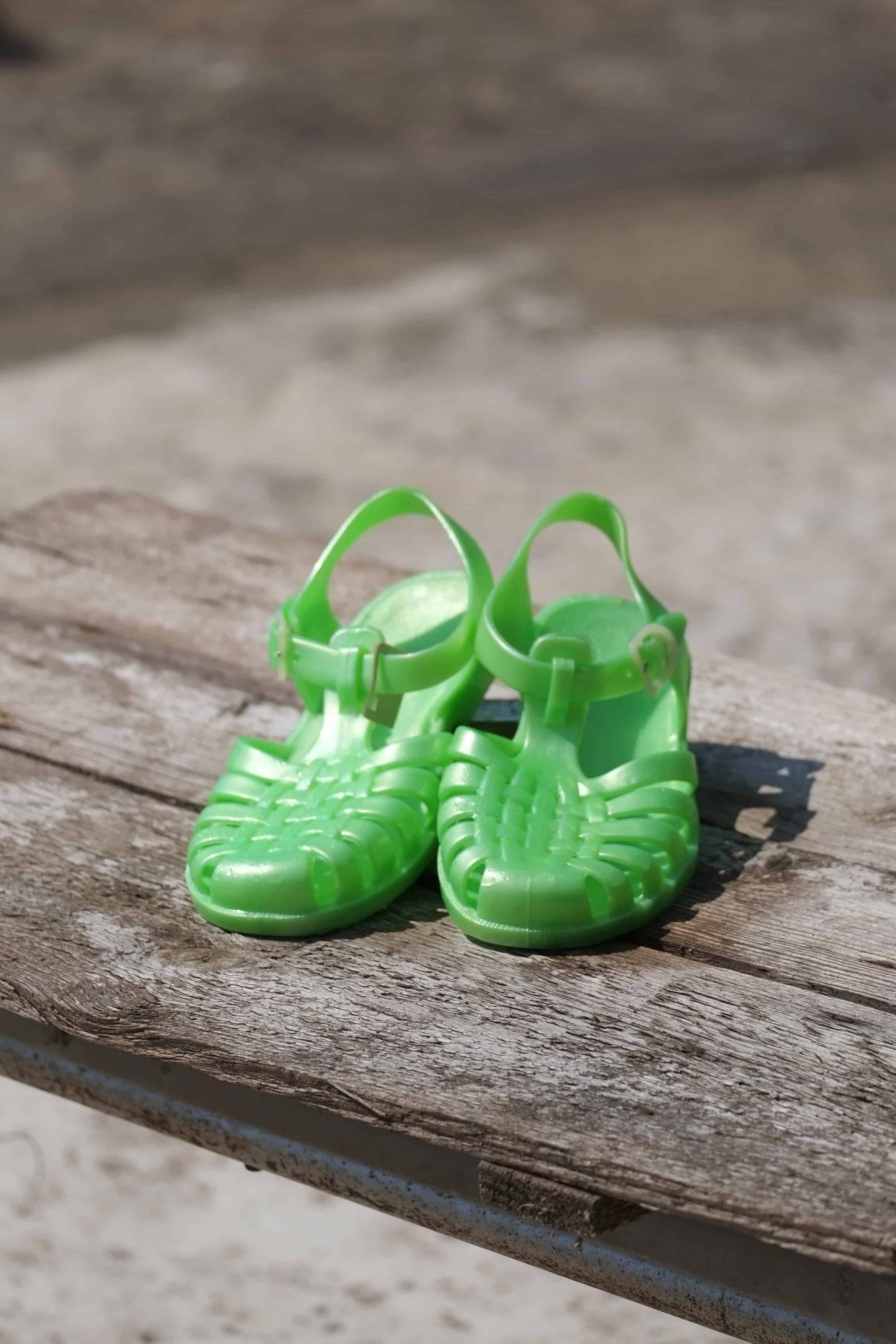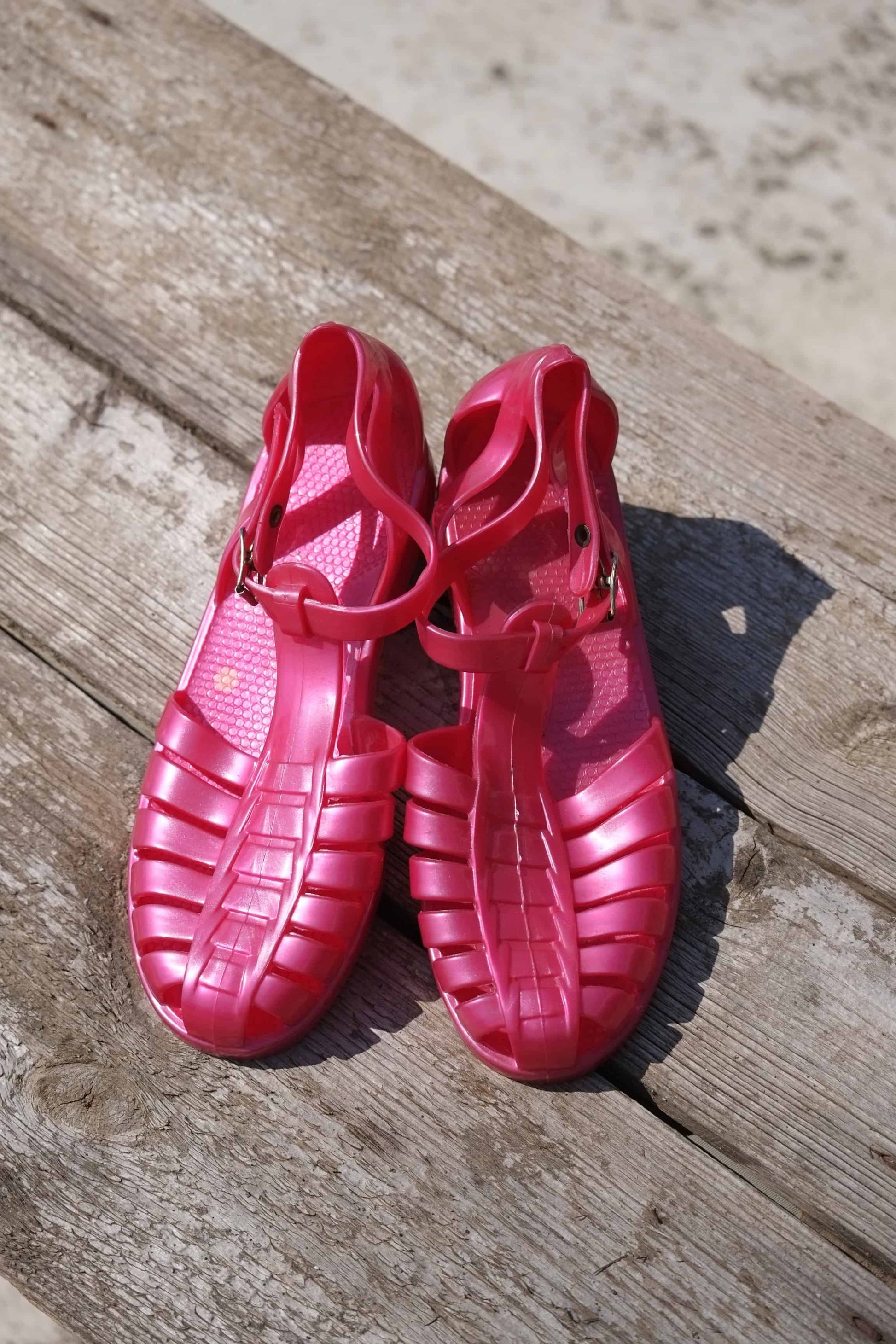 Retro 80's jelly summer sandals, vintage practical and fun summer shoes for the kids! Made in France in the early 80's. Designed like the T-Bar fisherman sandals, they help with air circulation on the feet. Made from high-quality, flexible, and safe PVC, these jellies are incredibly soft and comfortable.