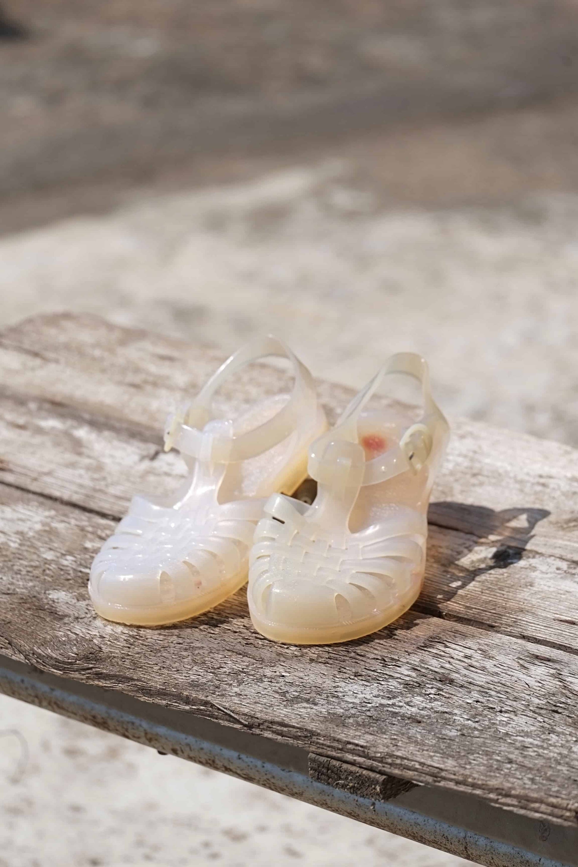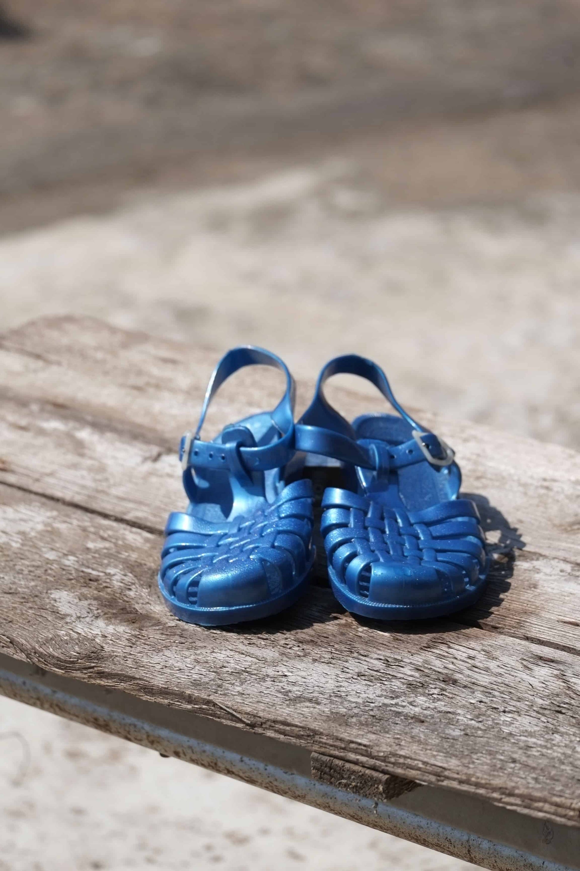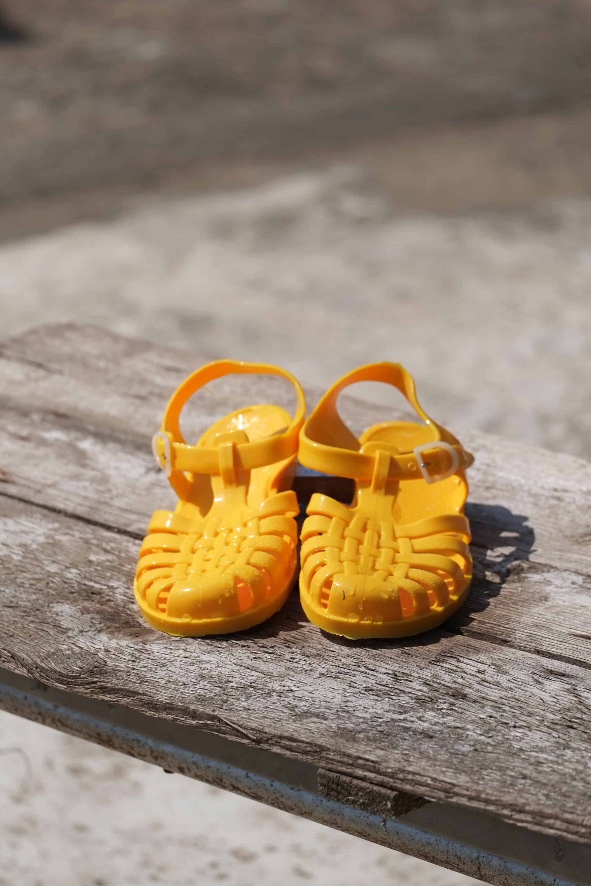Retro 80's jelly summer sandals, vintage practical and fun summer shoes for the kids! Made in France in the early 80's. Designed like the T-Bar fisherman sandals, they help with air circulation on the feet. Made from high-quality, flexible, and safe PVC, these jellies are incredibly soft and comfortable.