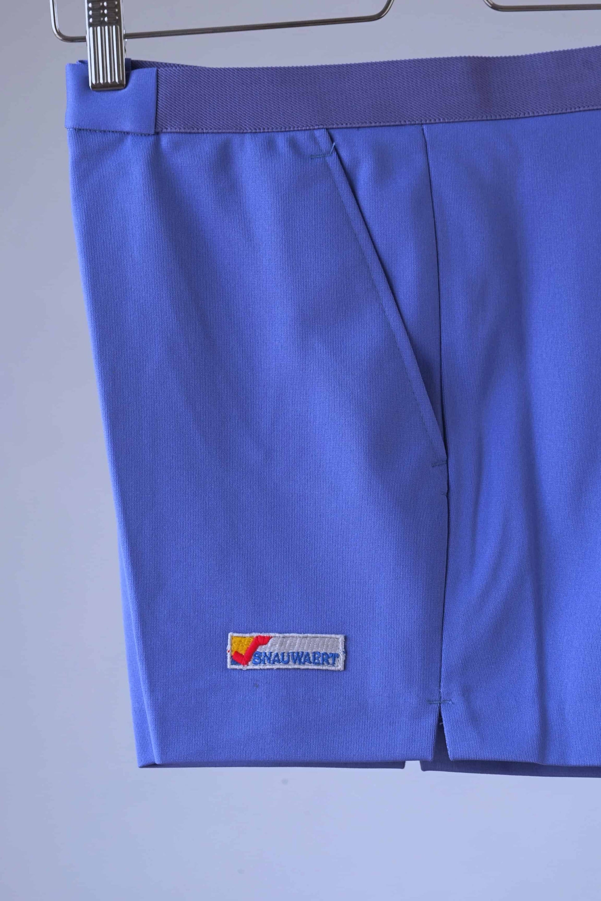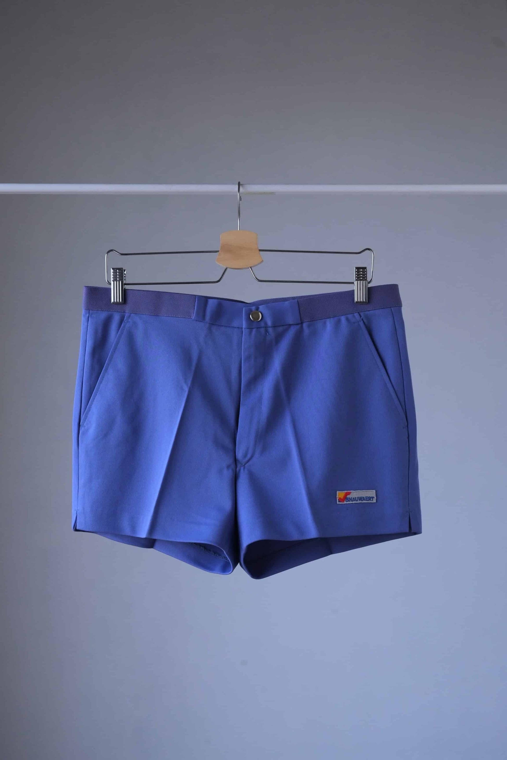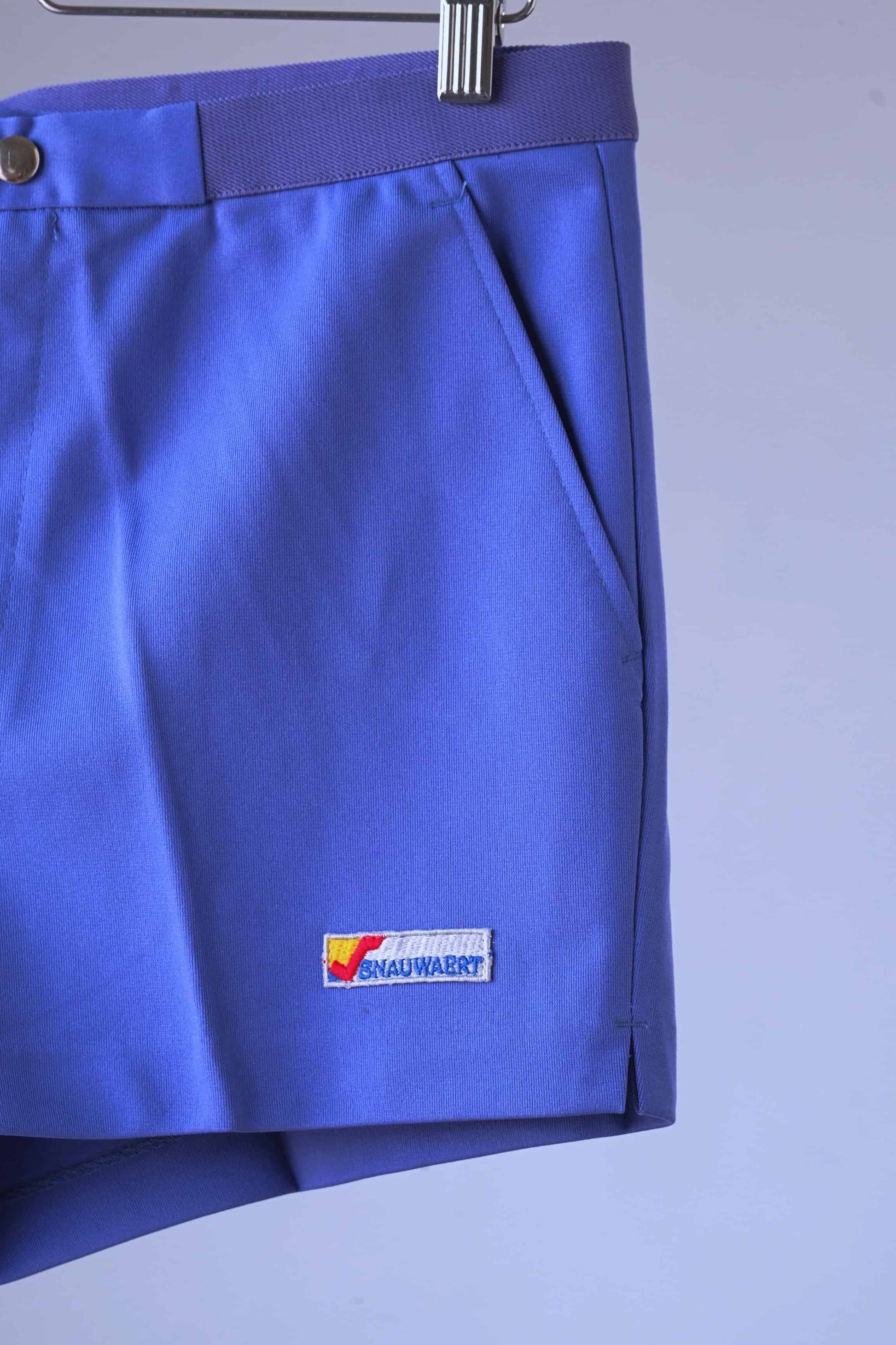 These late 1980's men's vintage tennis shorts feature a fantastic blueish-purple color. They come with two pockets, a snap closure reinforced with velcro, and a zipper closure. The waistband is elastic and the retro touch is complete with an embroidered logo on the leg.