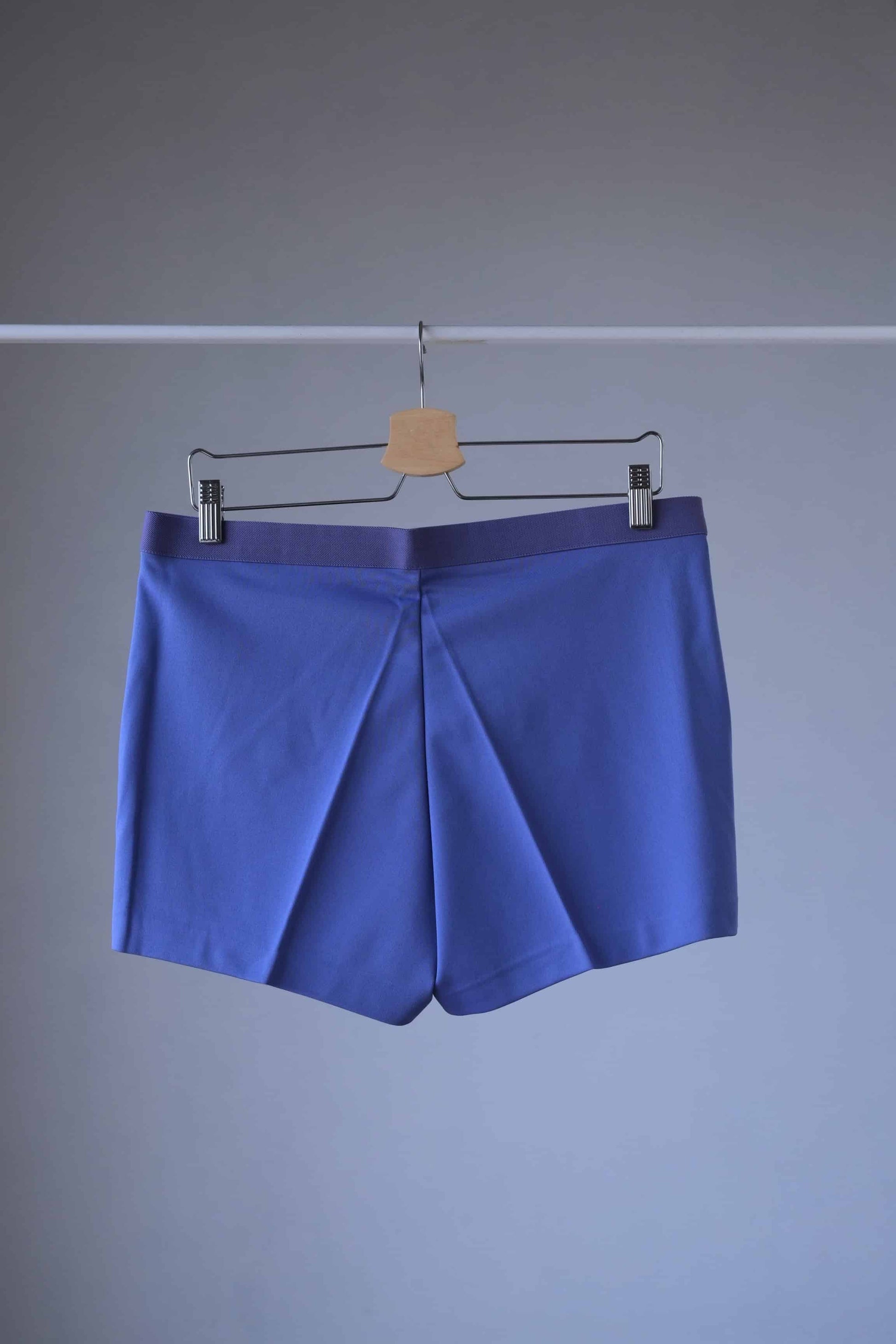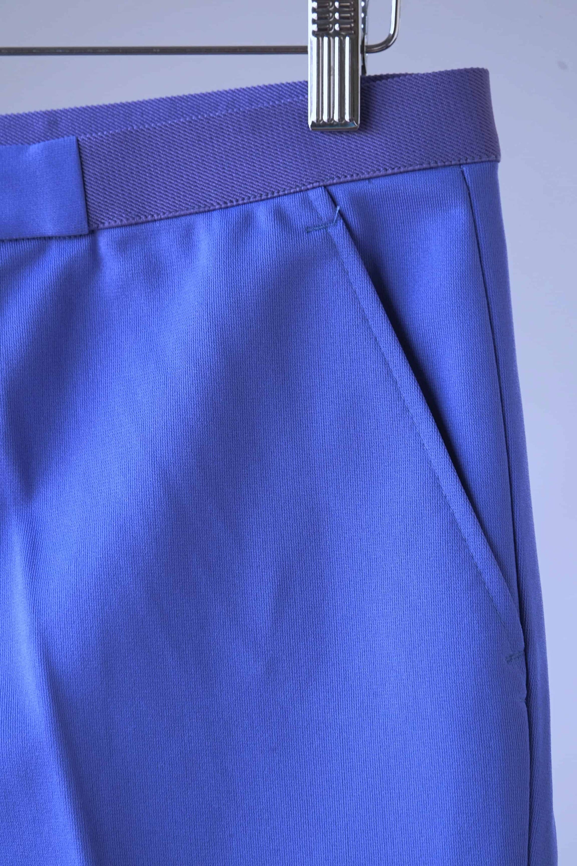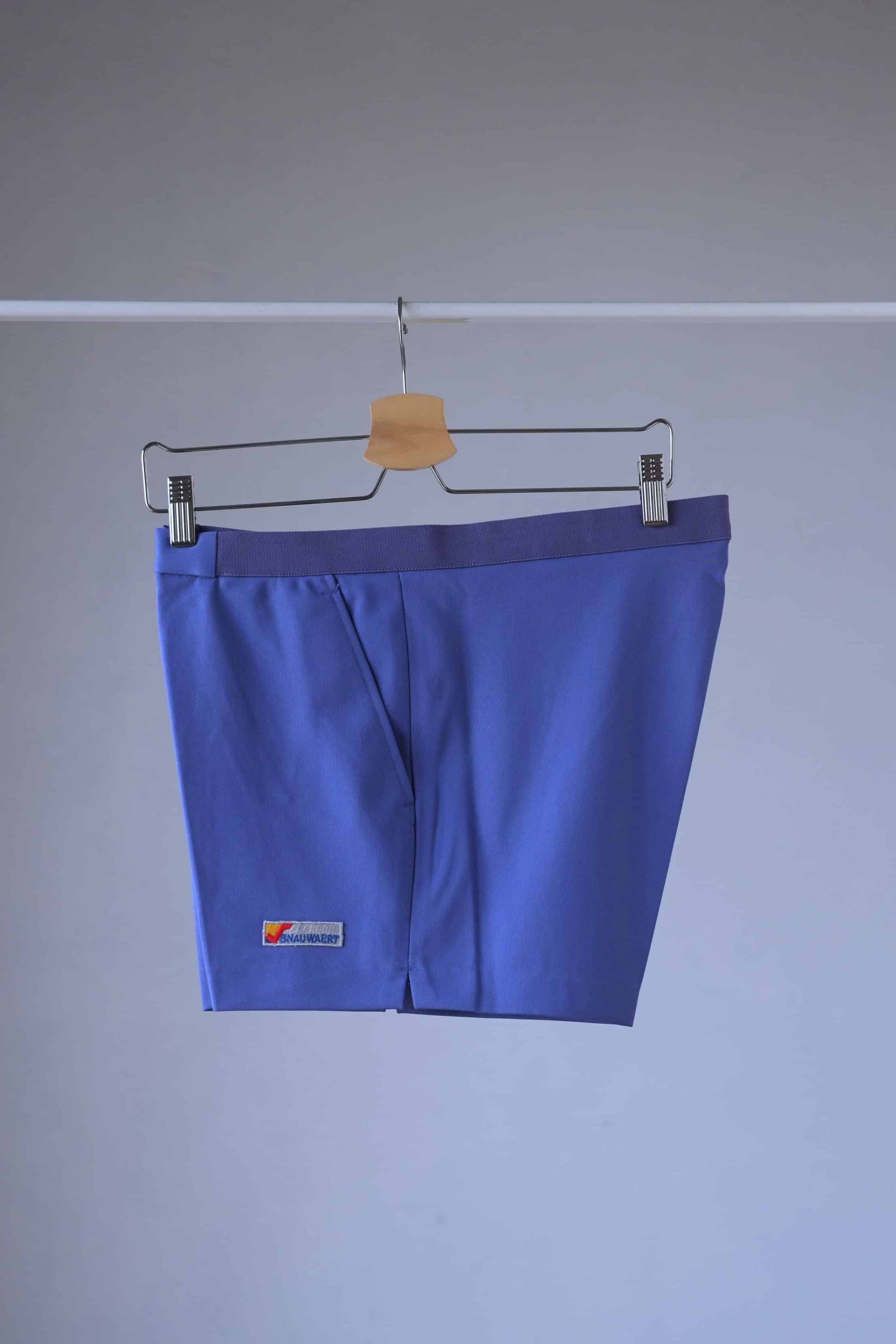 These late 1980's men's vintage tennis shorts feature a fantastic blueish-purple color. They come with two pockets, a snap closure reinforced with velcro, and a zipper closure. The waistband is elastic and the retro touch is complete with an embroidered logo on the leg.