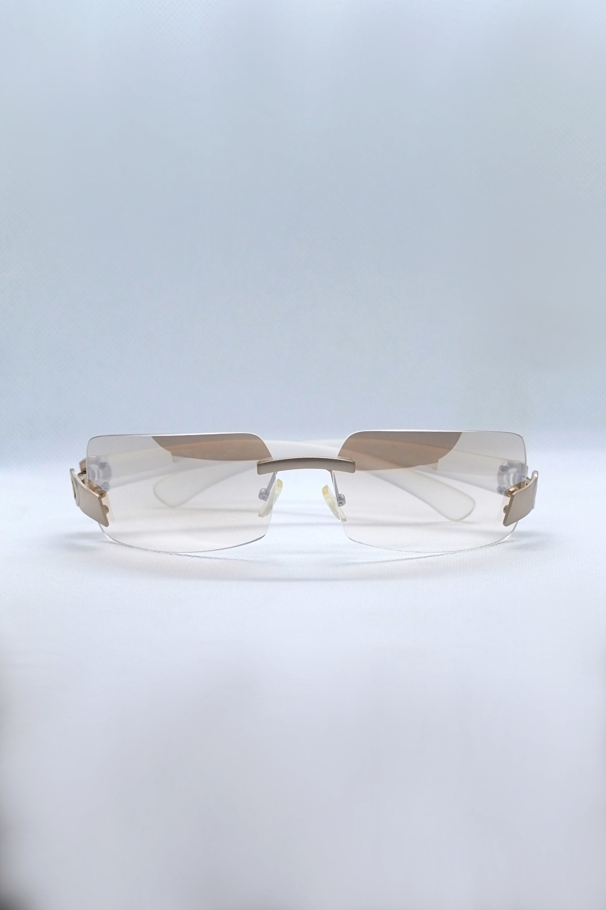 Y2K sunglasses, smoked rectangle lenses, with wide plastic arms and visible brushed metal hardware.