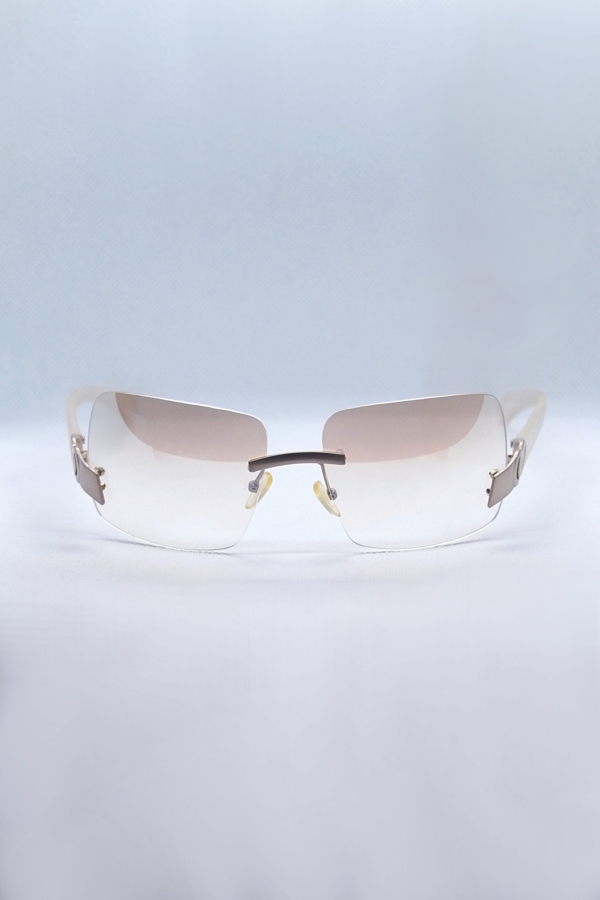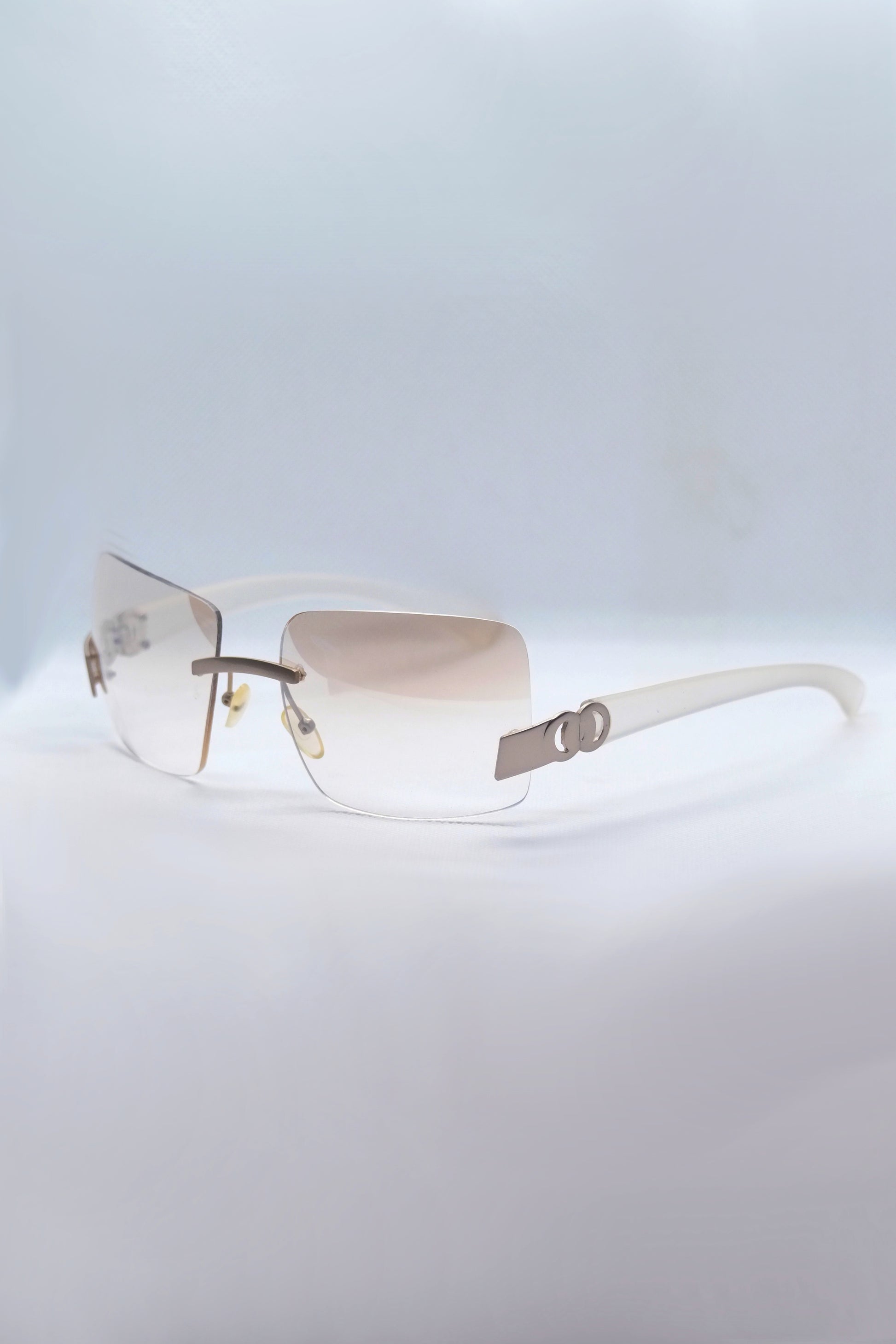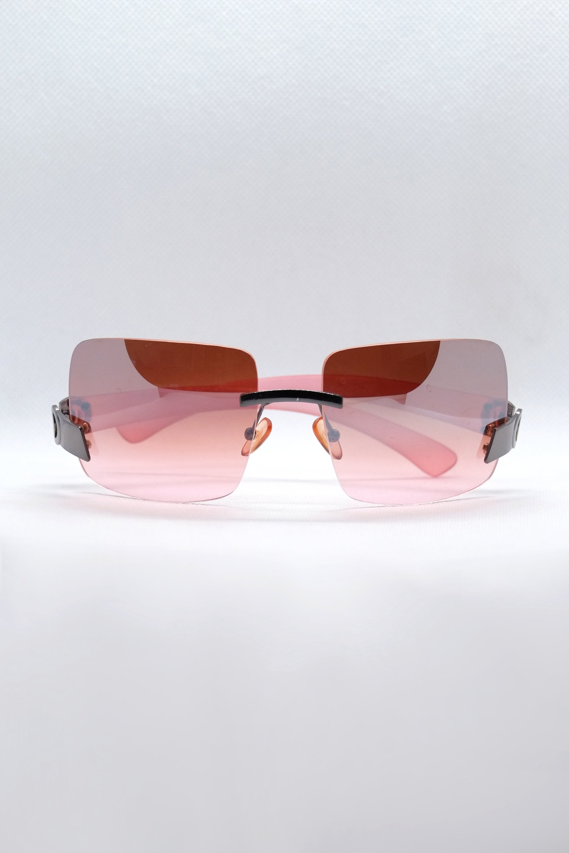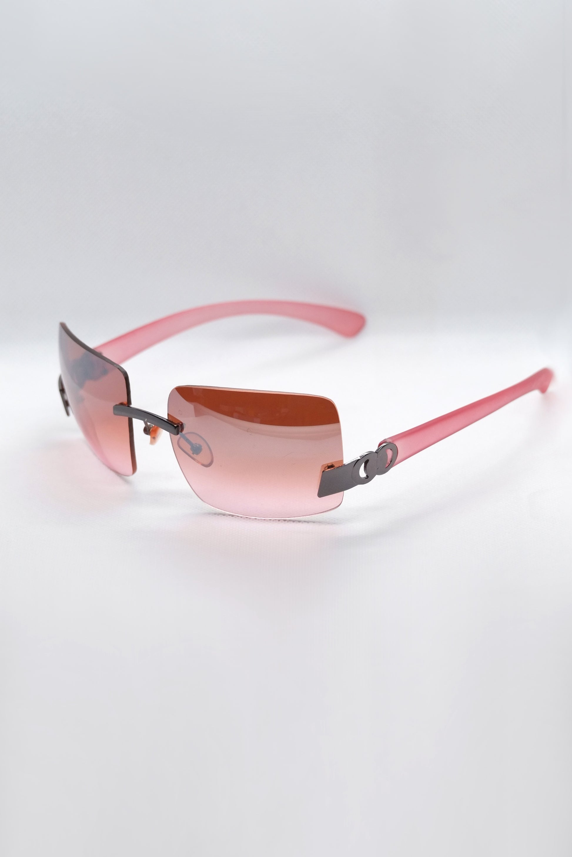 Y2K square sunglasses, rimless tinted gradient lenses in 2 colors, pink and clear. featuring plastic colored arms and visible hardware.