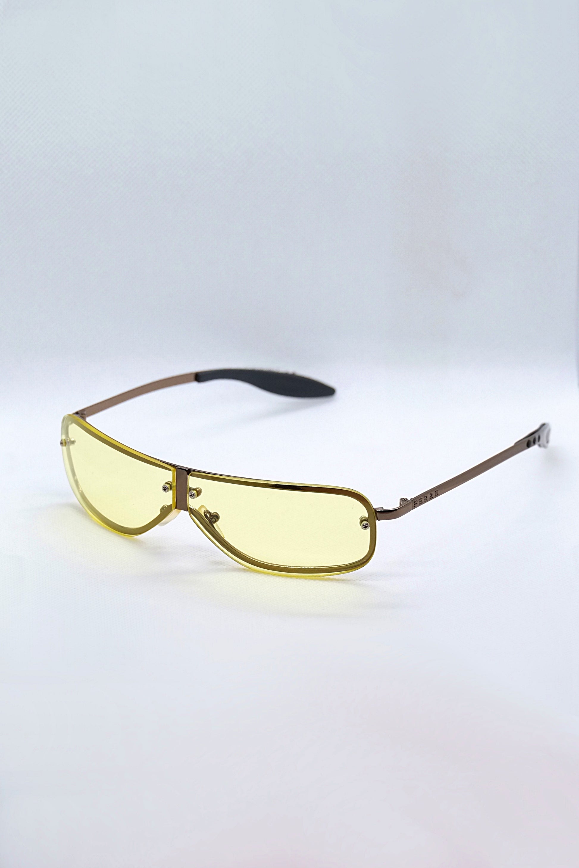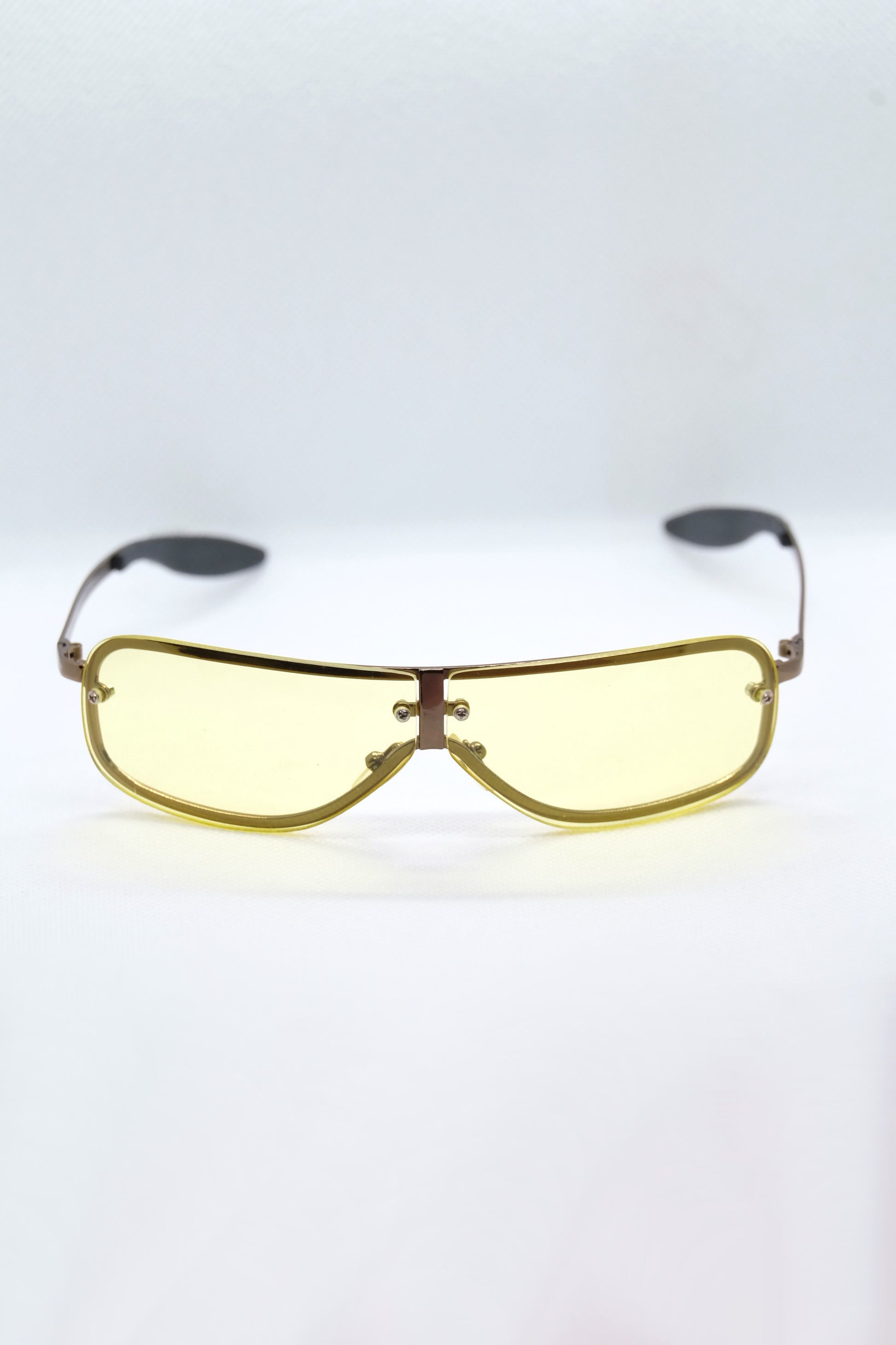 Vintage 2000s sunglasses, clear yellow tinted lenses over a gunmetal frame with visible screws. Y2K shield sunglasses with lenses mounted over the frame giving them a rimless look.